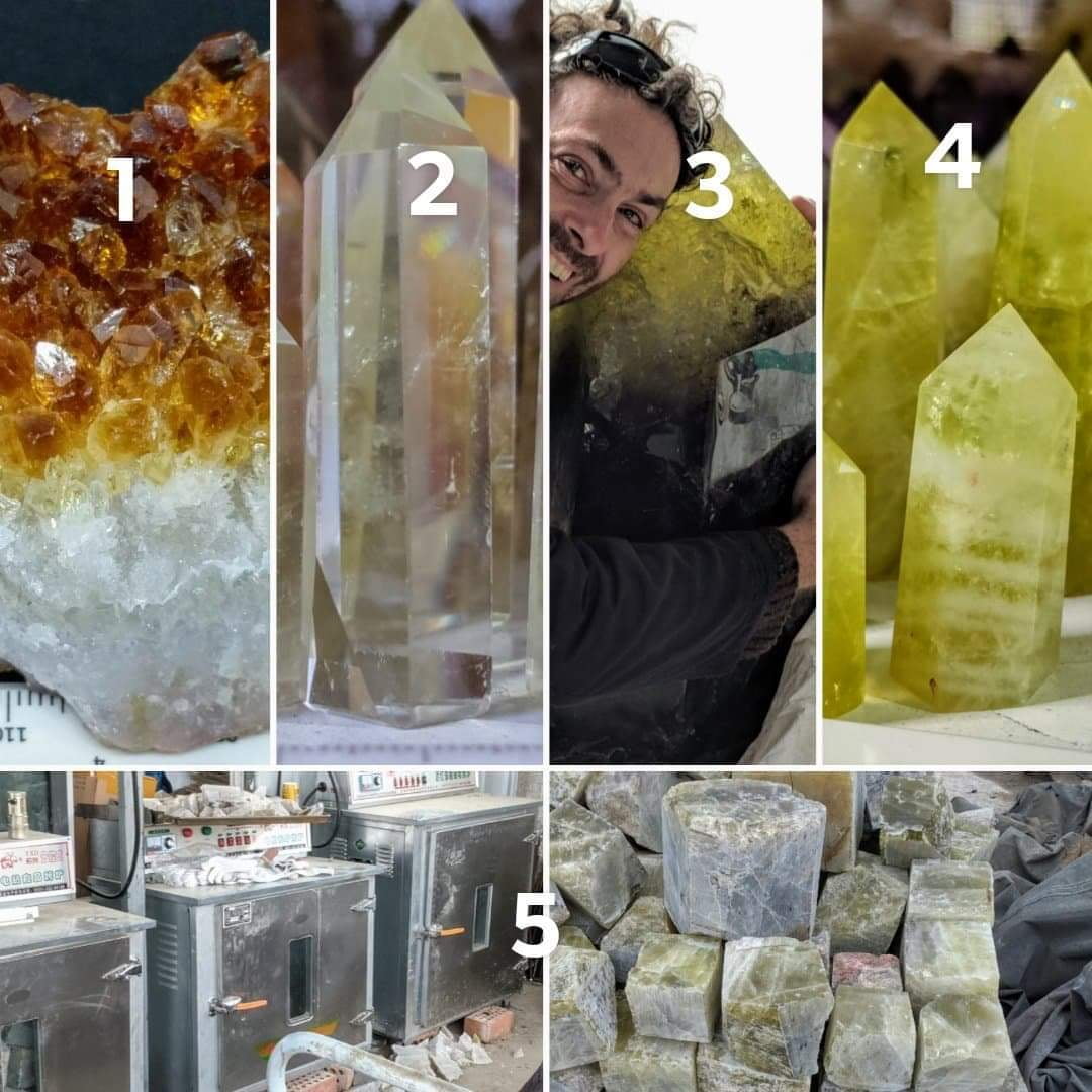 #4&5 Lemon Quartz. Aluminum based (smokey quartz) We're using this term to refer to smokey citrine that has been processed by heating in kilns (#5) to drop the smokey out. This produces a very yellow and slightly green color and we watched them do it in China.