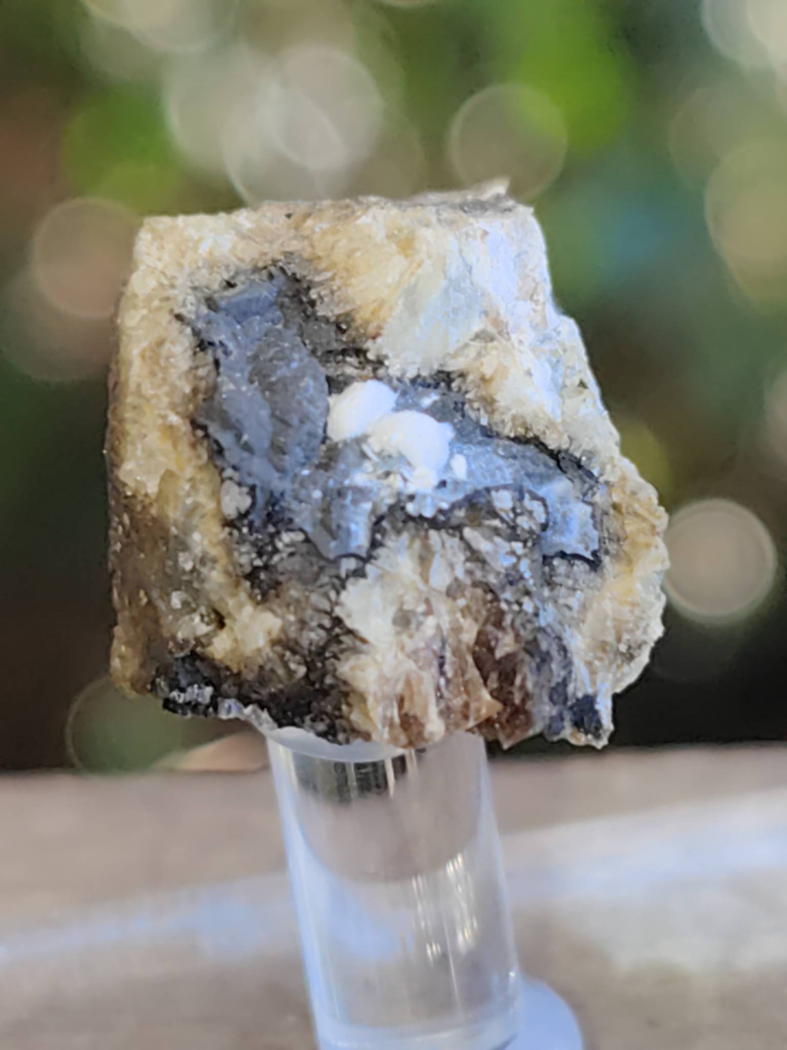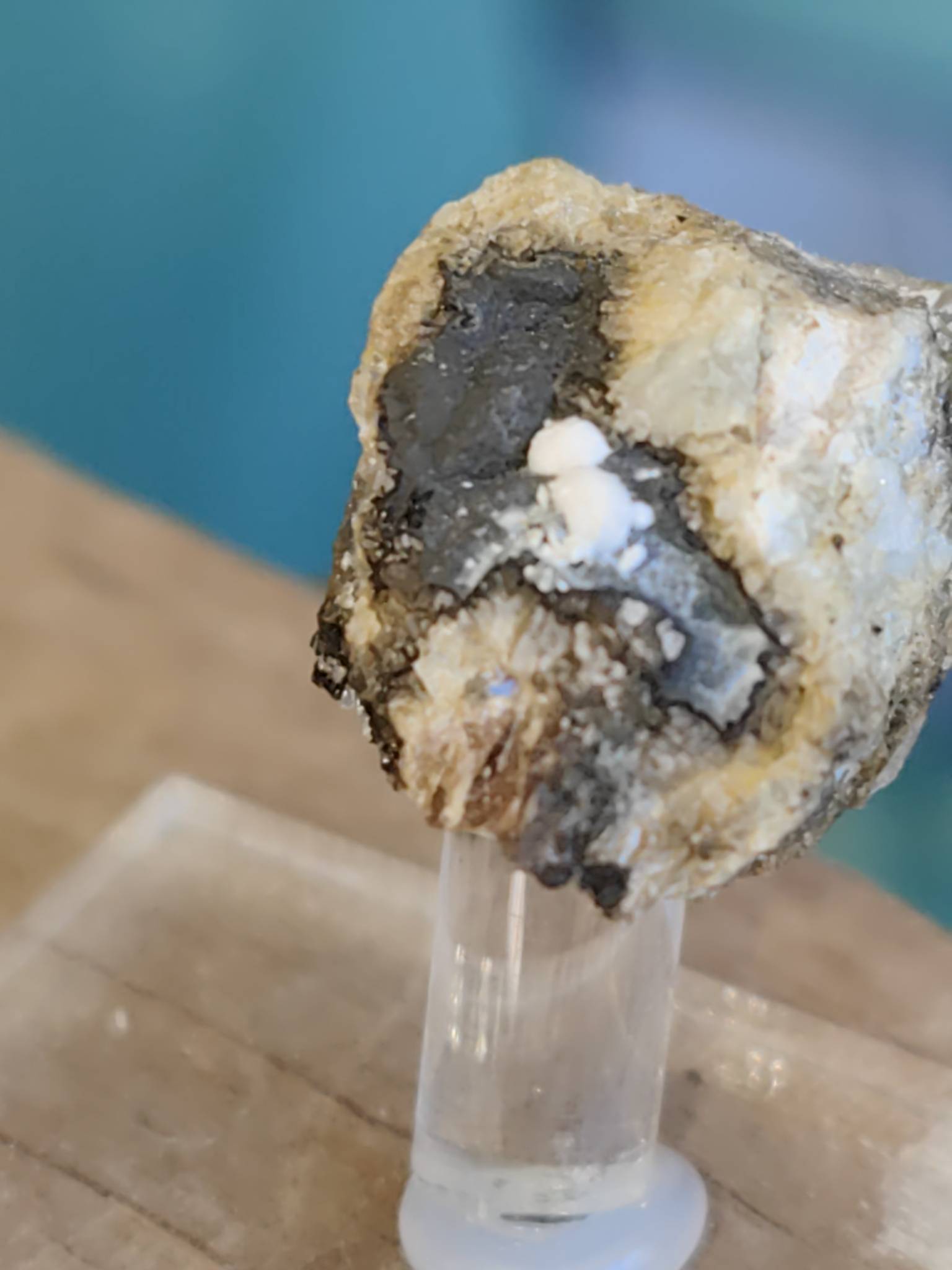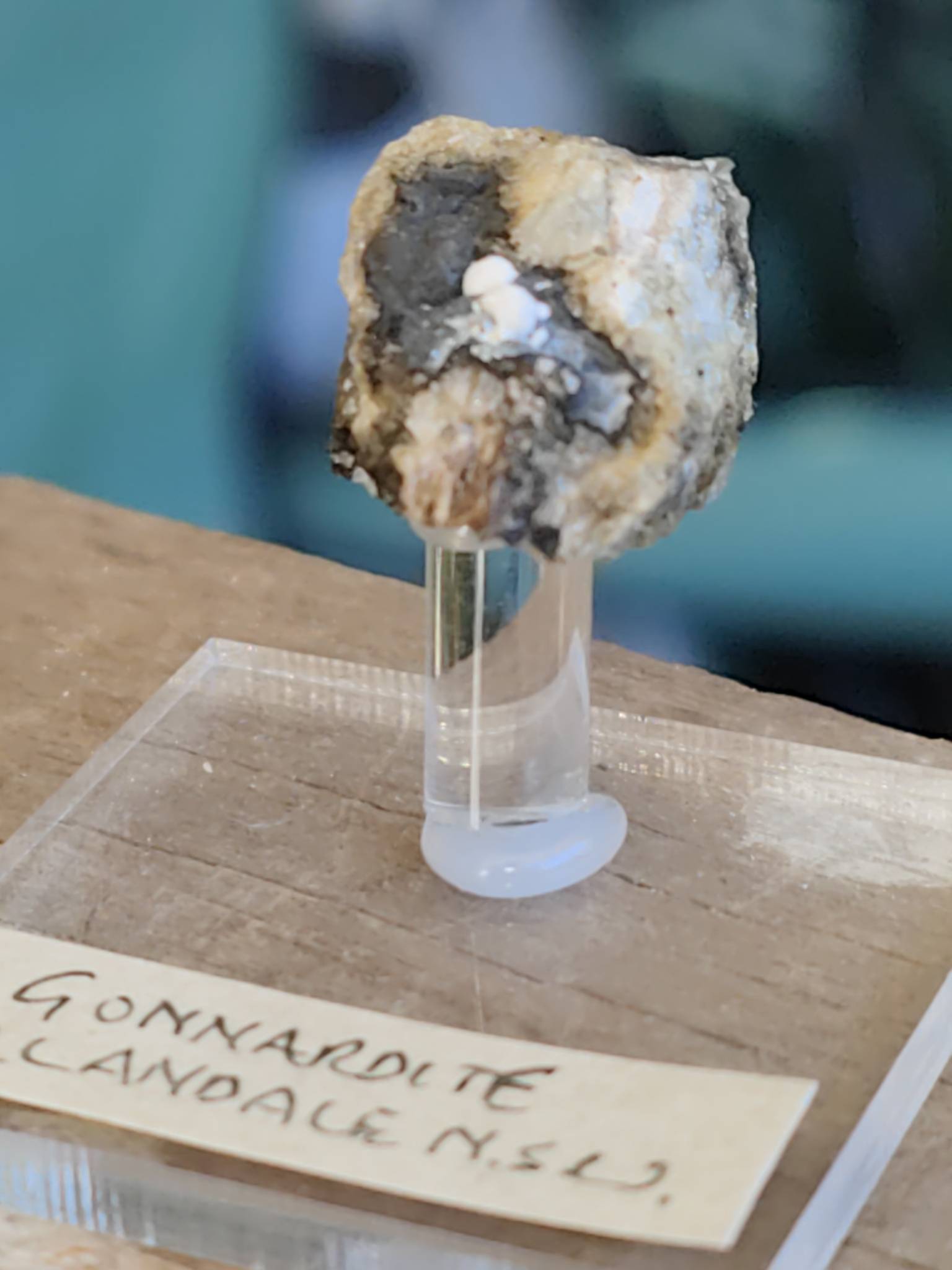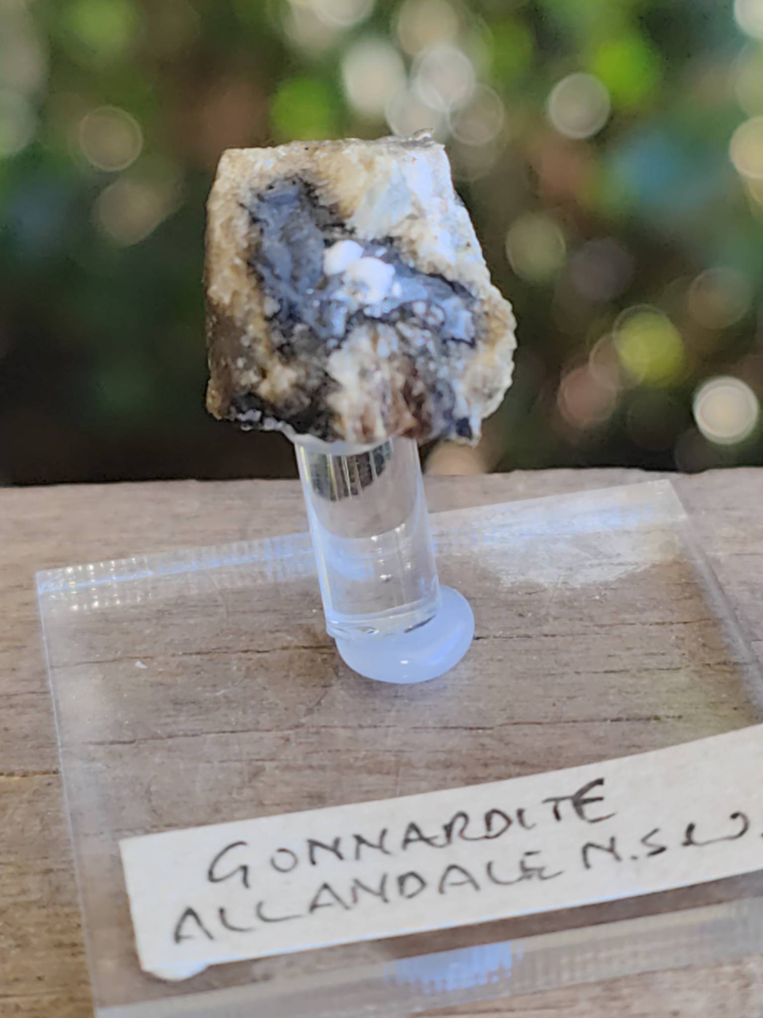 Mount088 white gonnardite crystals on a dark matrix from Alandale NSW. 17mm mounted on 34mm base. $9