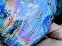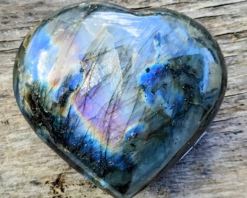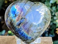 HT1017 Purple Labradorite Heart, puffy. 88mm Blue, purple and lilac flash. $49 there is a pierce that looks fractured but is solid.