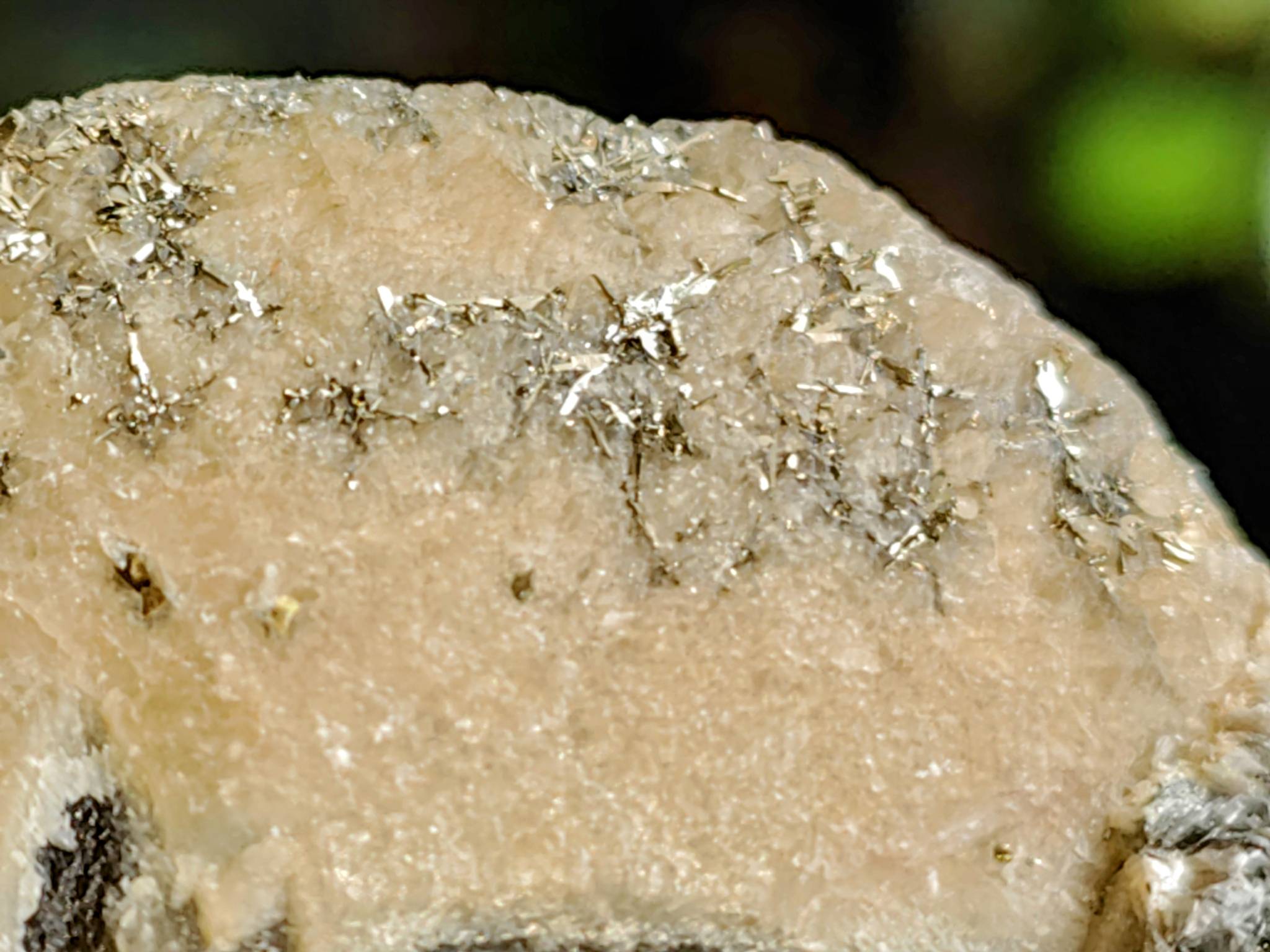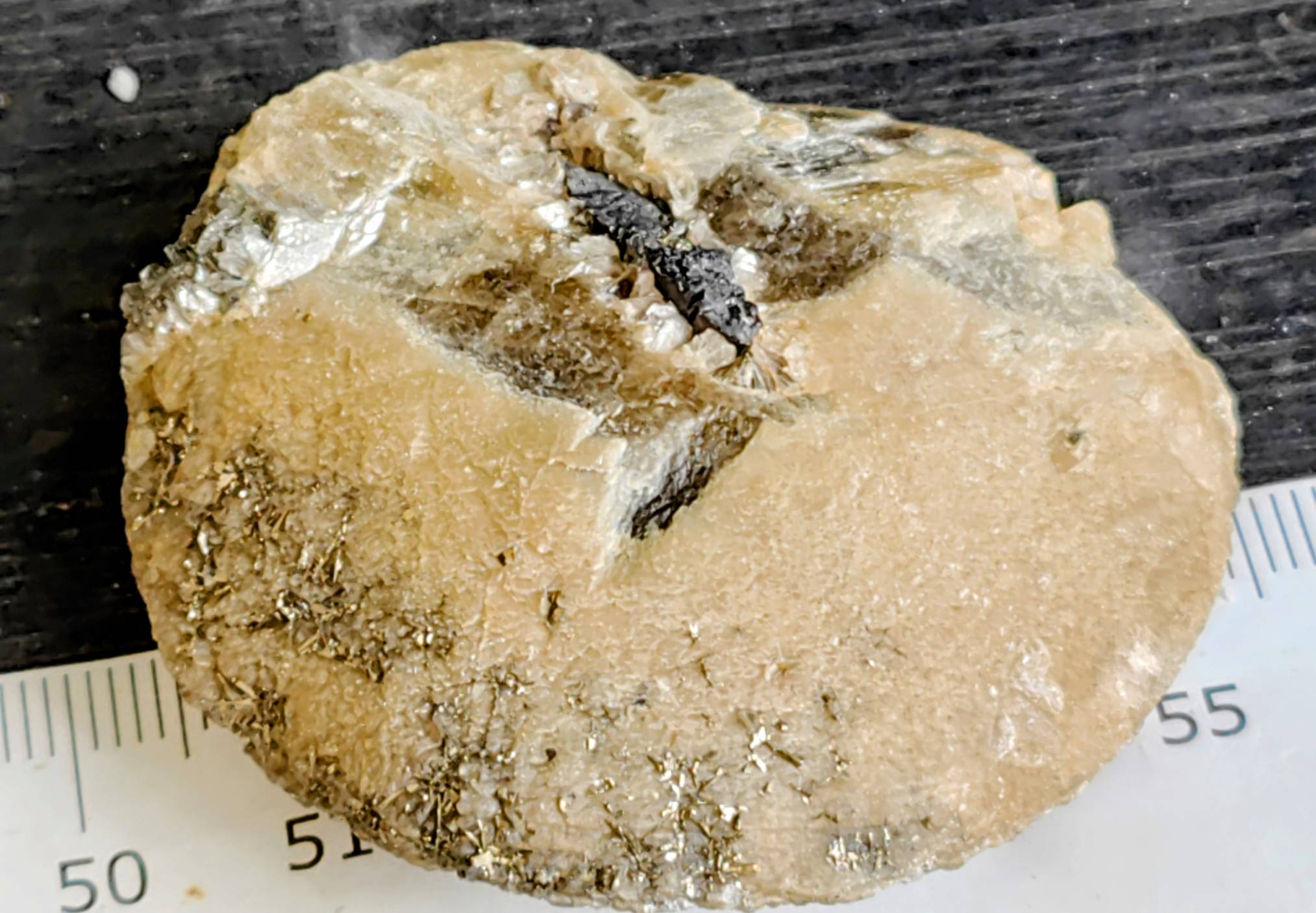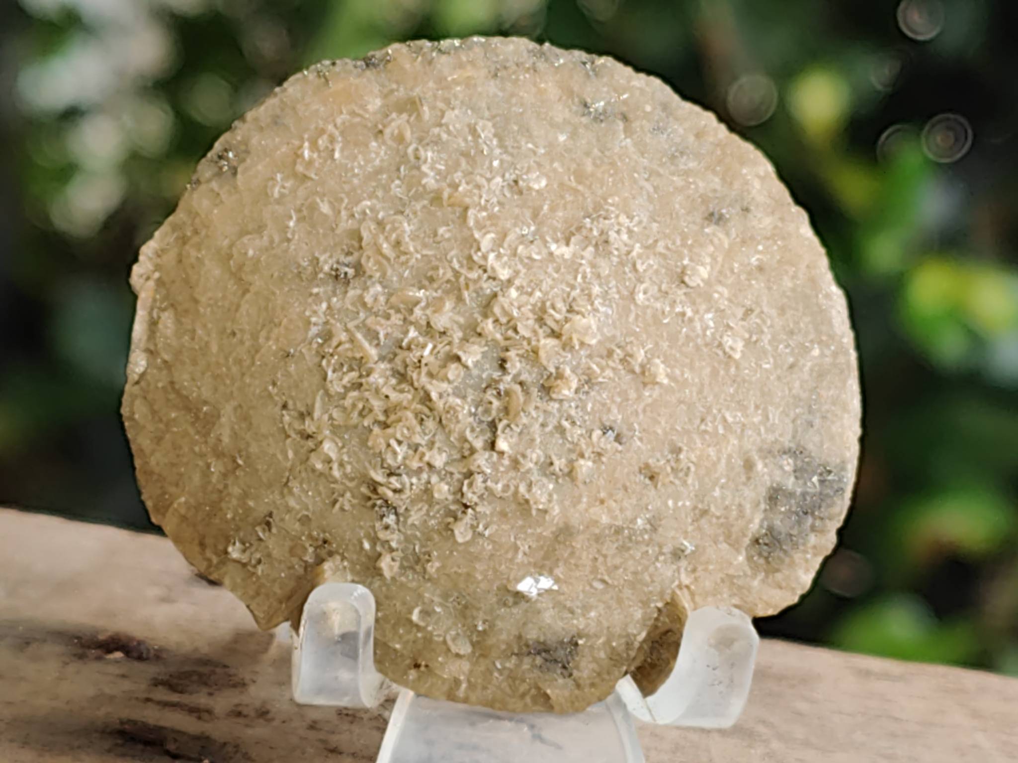 Siderite disc with pyrite from Panasqueira, Portugal. Exceptional shape and size (50mm), beautifully coated with a dusting of pyrite cubes.