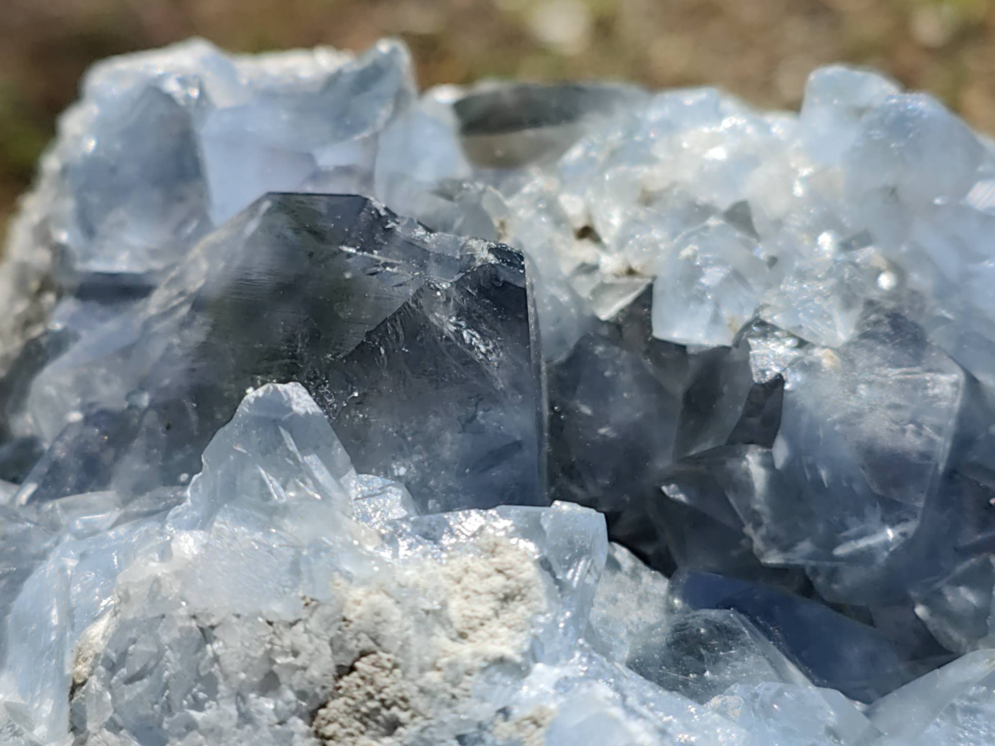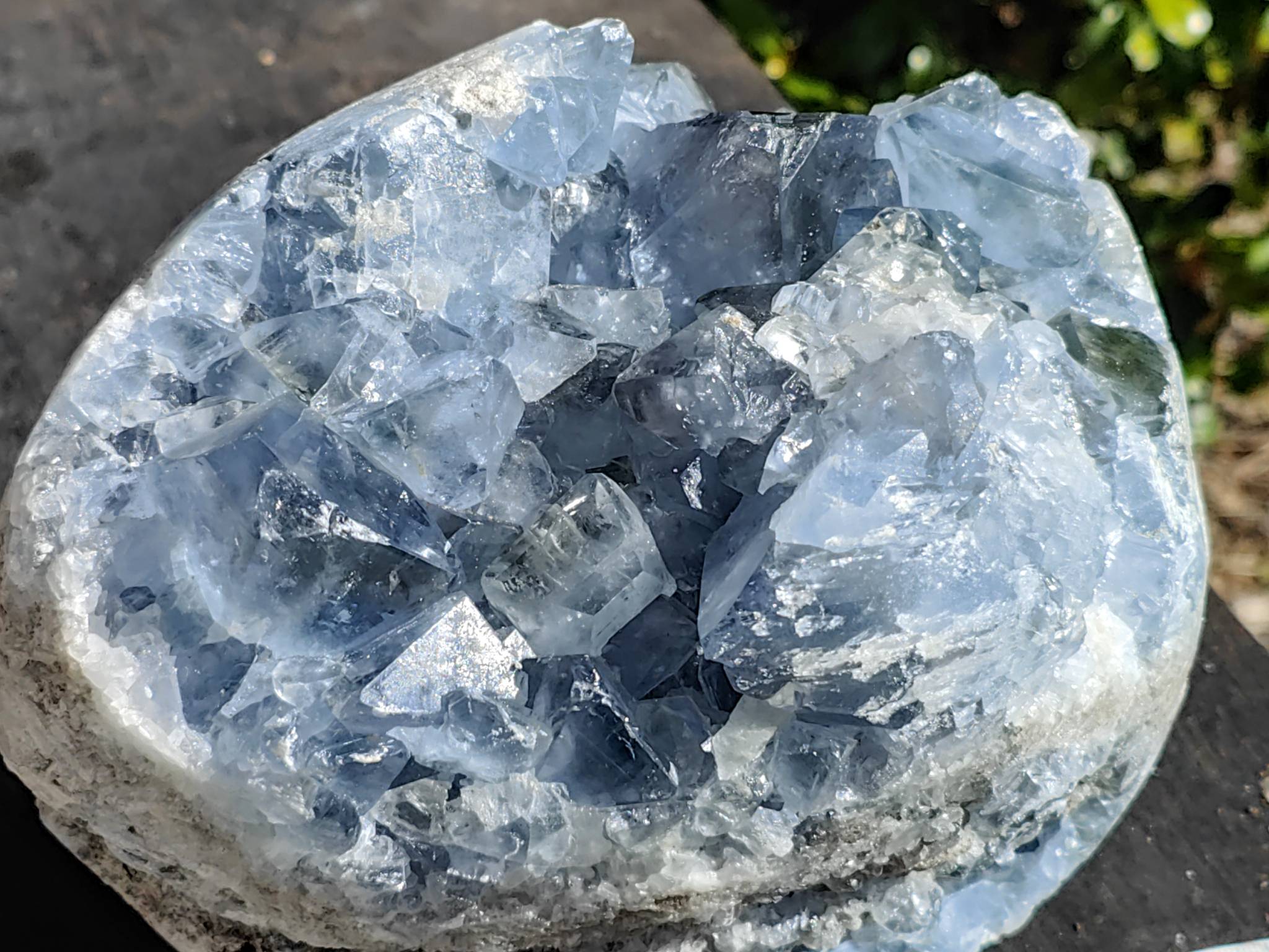 Large example of celestite from Madagascar. This piece has multiple patches of crystals with rich colour. Some of the crystals are particularly large making this a striking statement piece