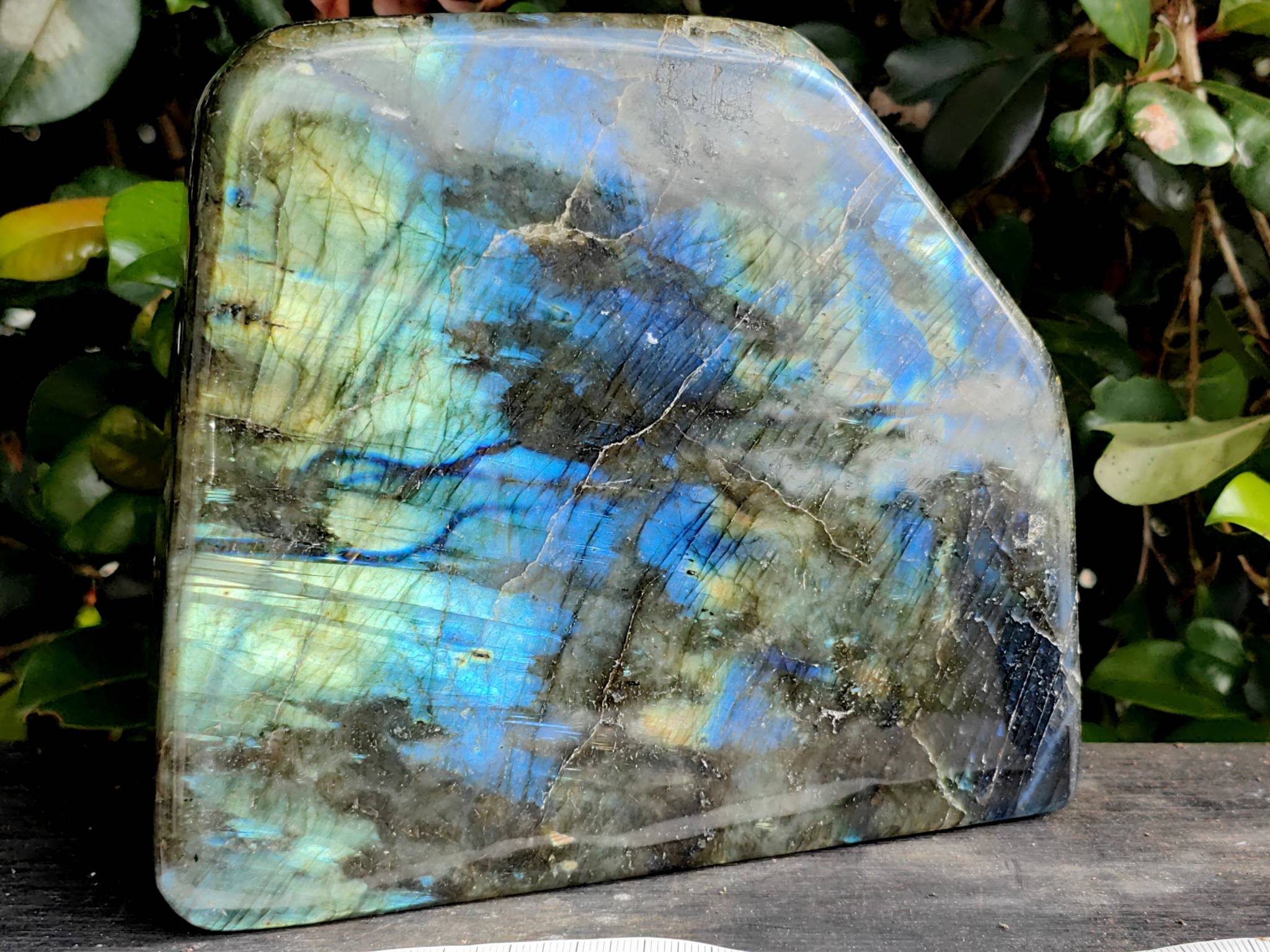 XL1033 Large Labradorite with yellow and blue flash. 3.15kg, 16cm wide 14cm high, $190