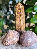 Miriam set; Also known as elephant shin jasper and Calligraphy Stone is actually thousands of fossilised shells. Generator 66mm, Sphere 48mm, Palmstone 52mm, Heart 51mm Two tumbles