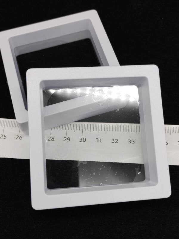Display case with stretch film. White, 7cm square These are fantastic for displaying delicate items like fossils as well as items that let light through like moldavite and agate slices
