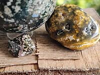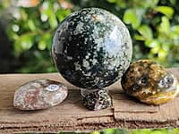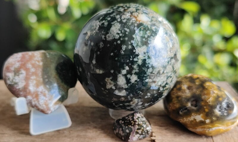 SET17 Ocean Jasper Set - 52mm sphere, 39mm polished, 36mm heart, mini tumble $32
