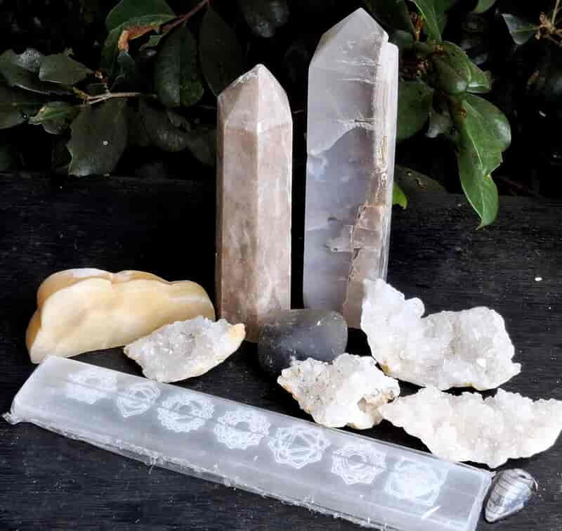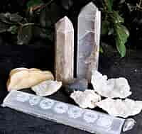 BB1029: Selenite chakra plate 205mm, Pink calcite gen 141mm, White agate obelisk 160mm, Orthoceras pend 32m, Smokey quartz 41mm, Yellow calcite cloud 88mm, Quartz 54mm-80mm 1.229kg $29