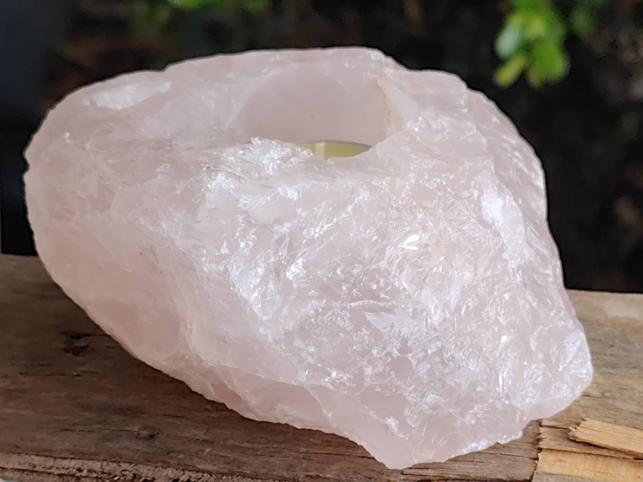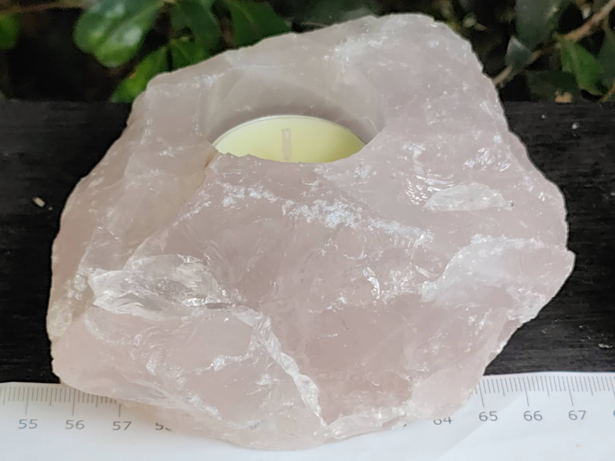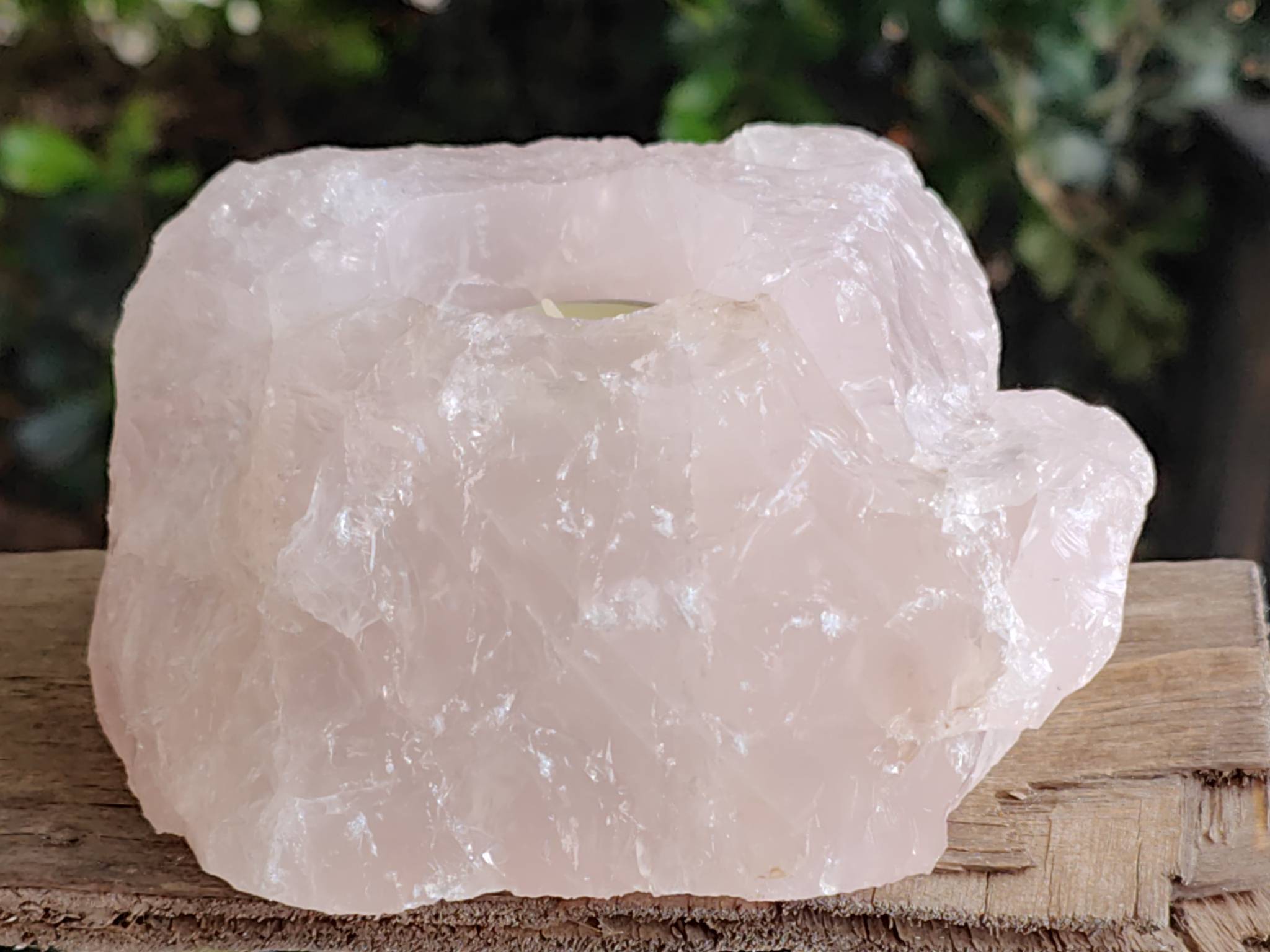 Rose quartz candle holder. 125mm 894g. Holds a standard tea light candle.