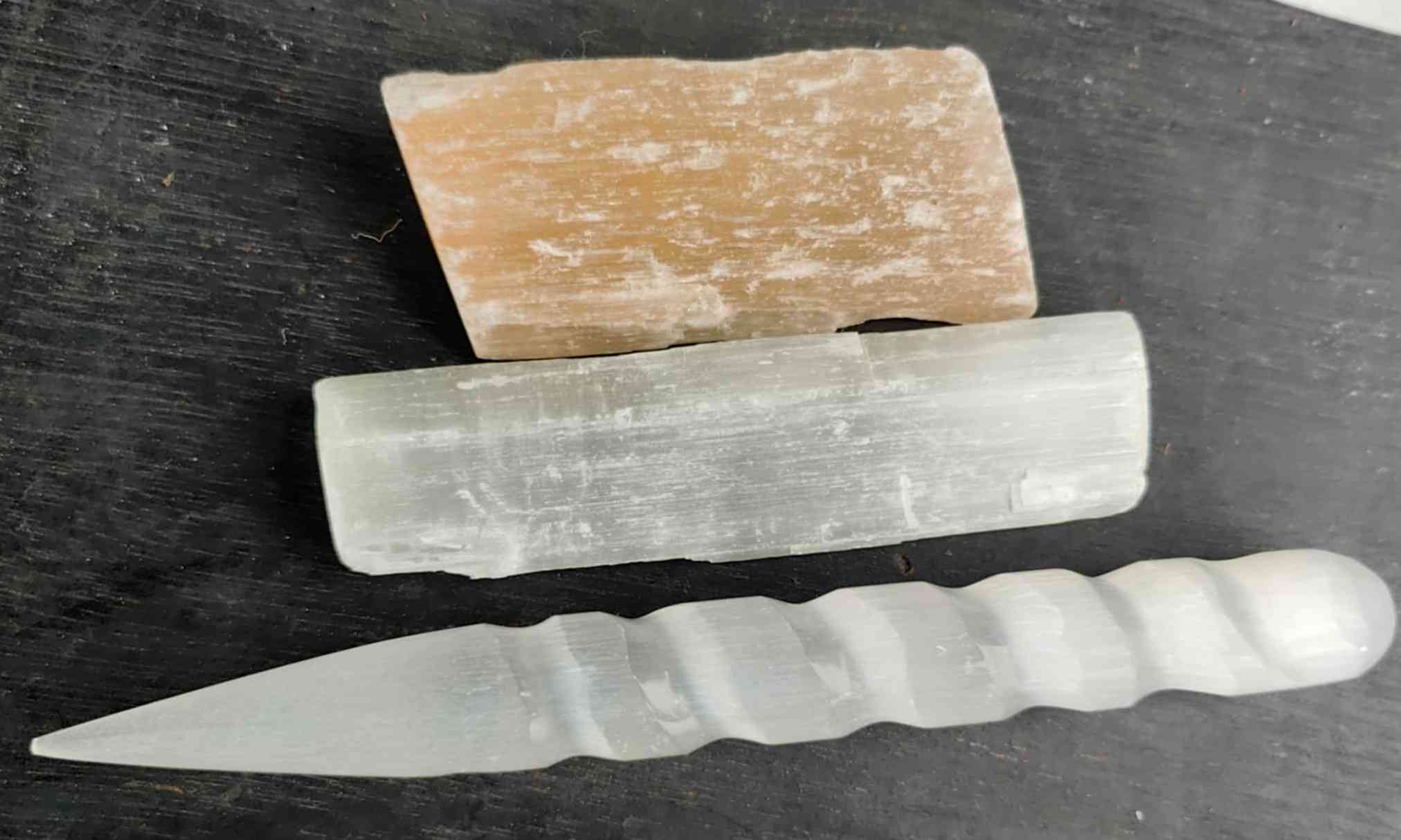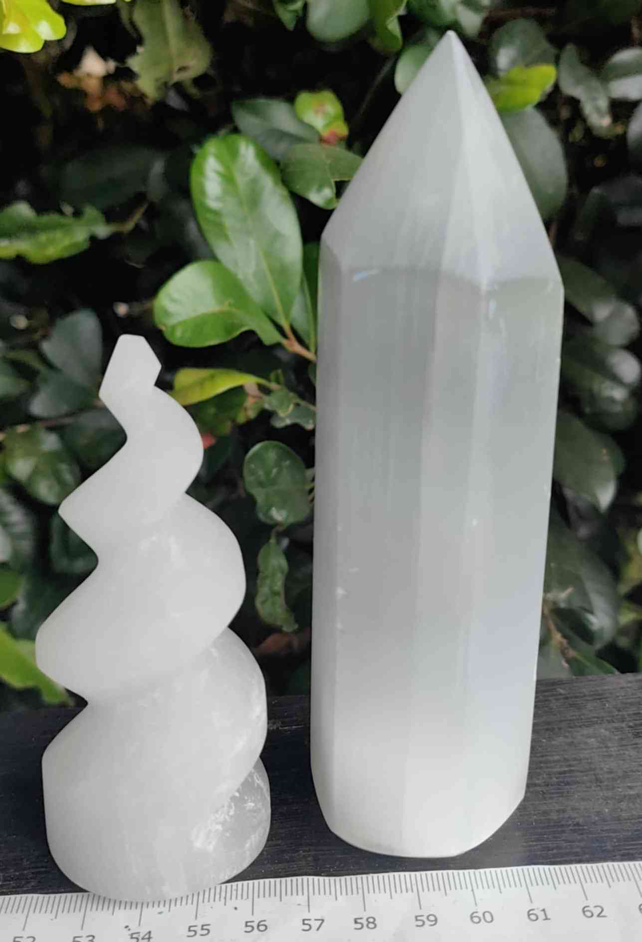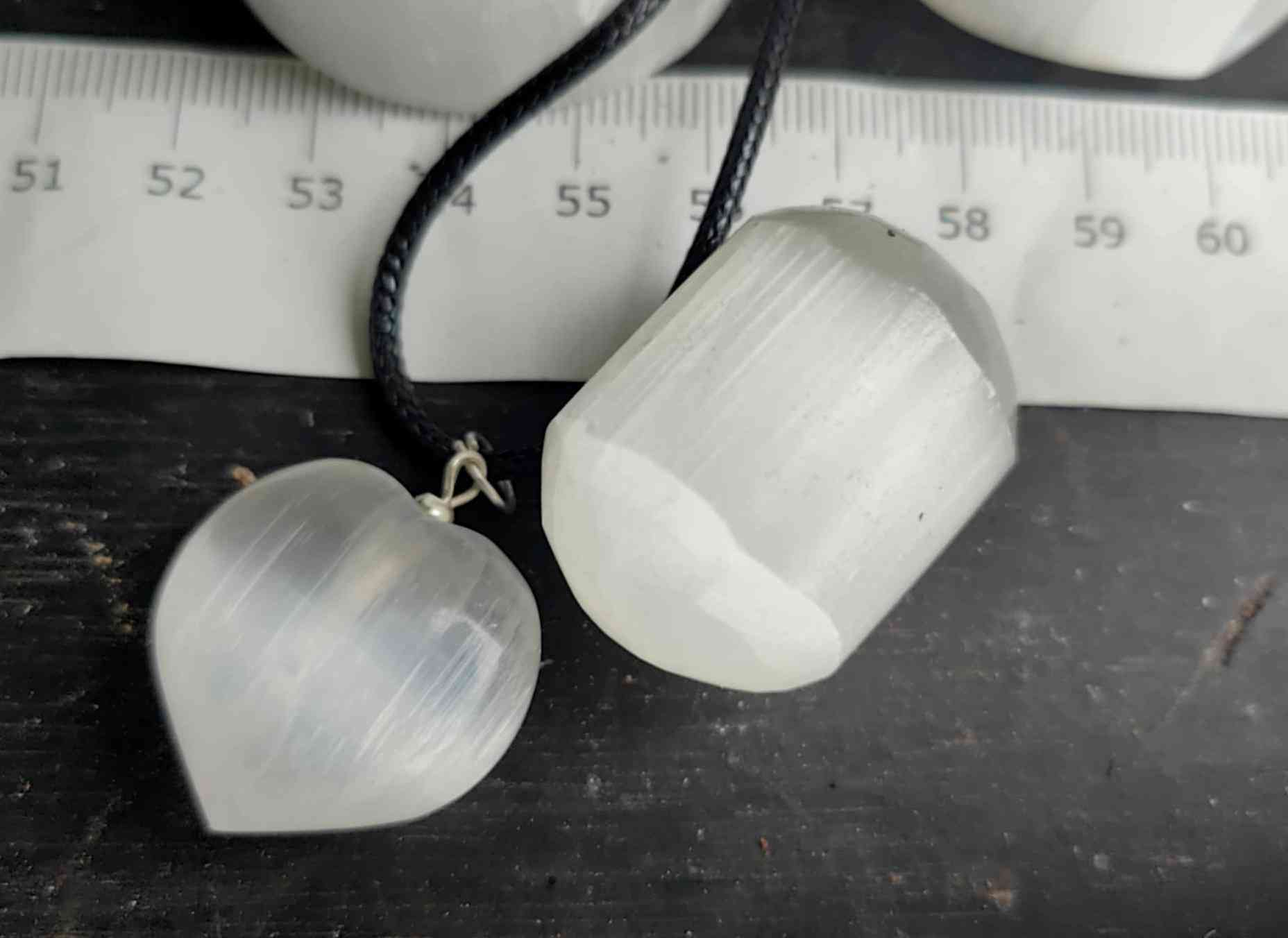 SET13 Selenite (Satin Spar) Set: (2 available) 14cm Generator, 10cm white selenite rod, 75mm Peach selenite, 30mm polished tumble , Heart pendant, 16cm wand, 10cm spiral $35