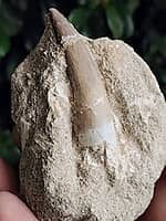 FOS1025 Large Plesiosaur tooth still in matrix with bone fragments. Matrix and tooth have been repaired. Tooth 56mm, total width 85mm $45