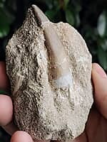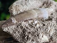 Plesiosaur tooth still in matrix with bone fragments.