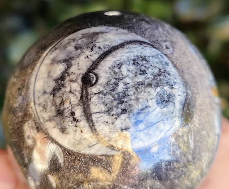 Multiple Fossil Orthoceras in a Marble sphere. Morocco