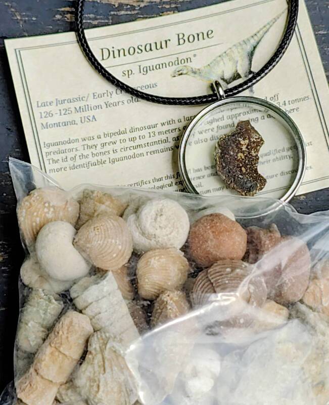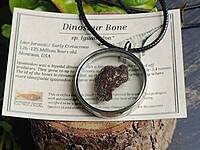 FOS1030 Iguanadon Dinosaur Fossil Pendant with small bag of mixed fossils. Pendant 21mm, removable bone. With Certificate $25