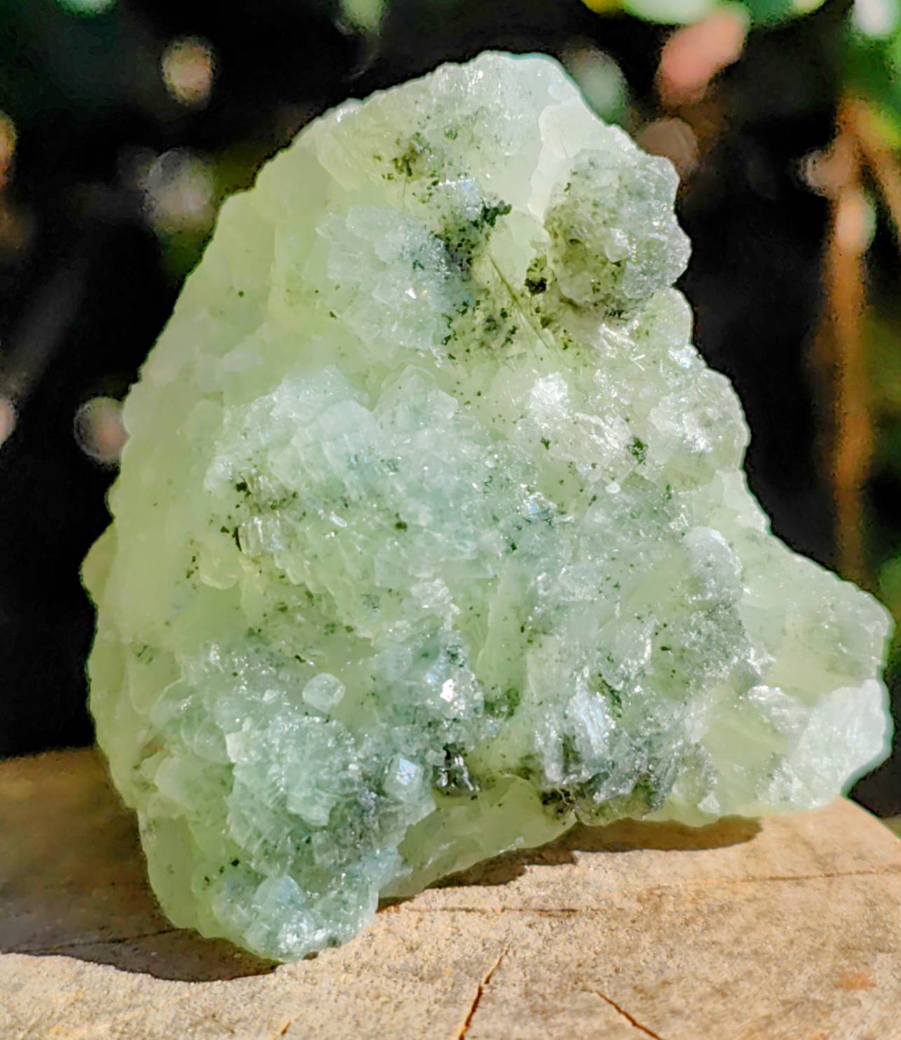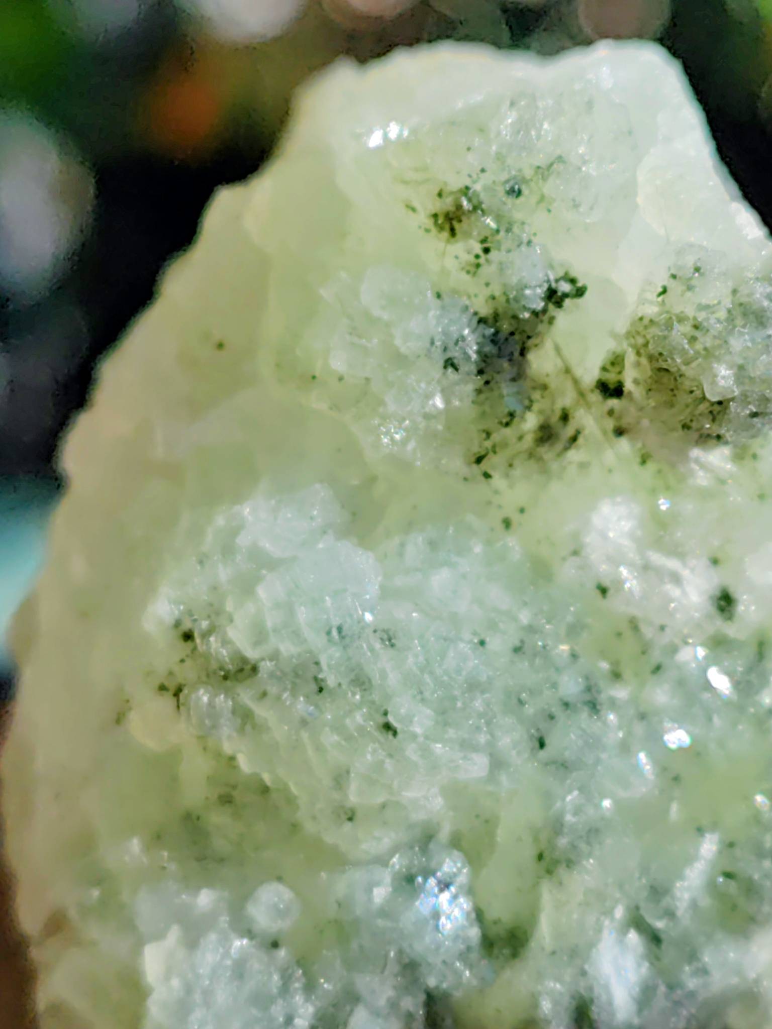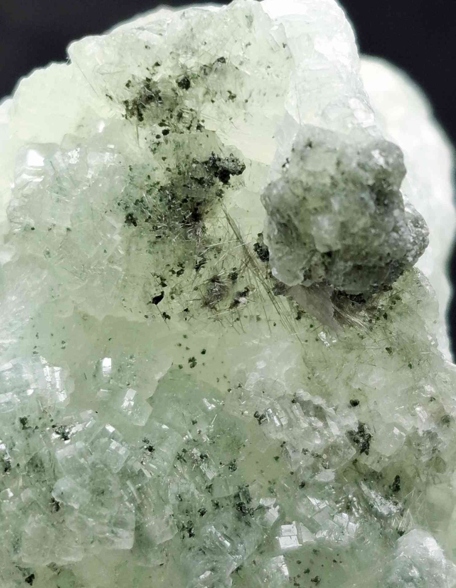 SPEC1091 (Video) Green prehnite with sparkling actinolite crystals. Boulemane, Morocco 43mm $35