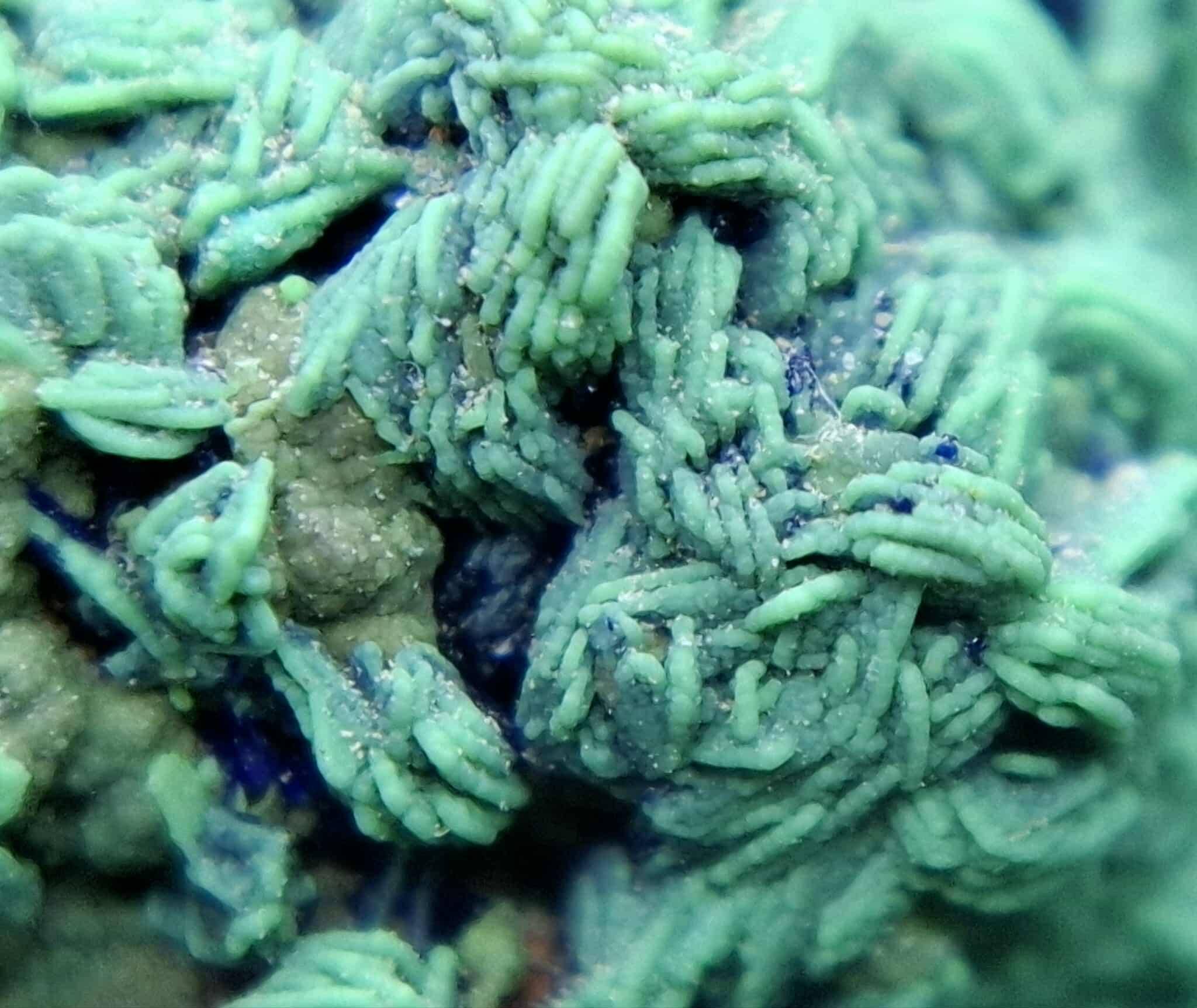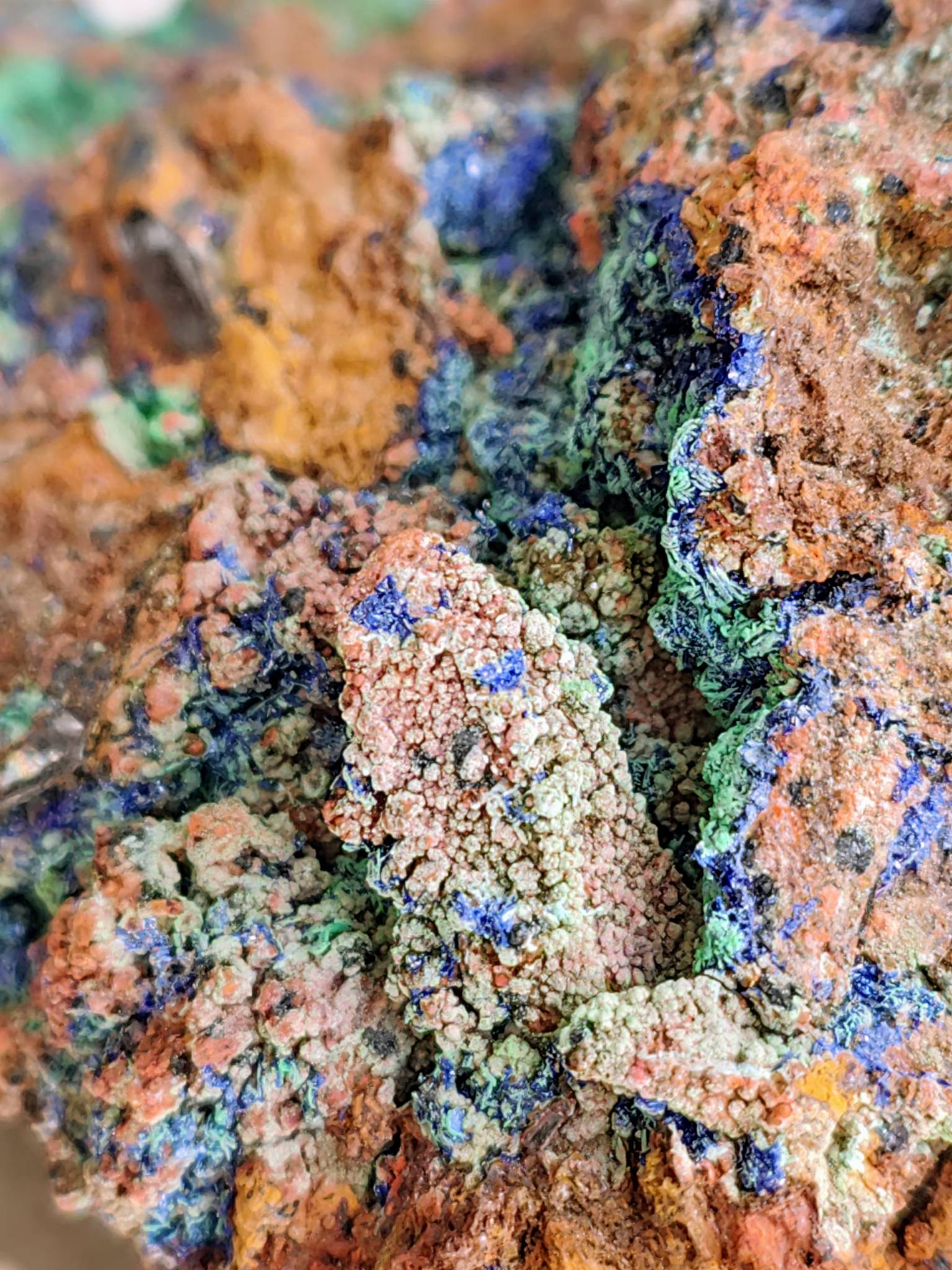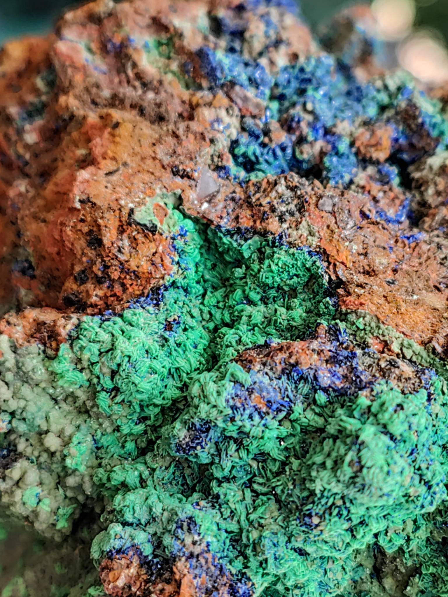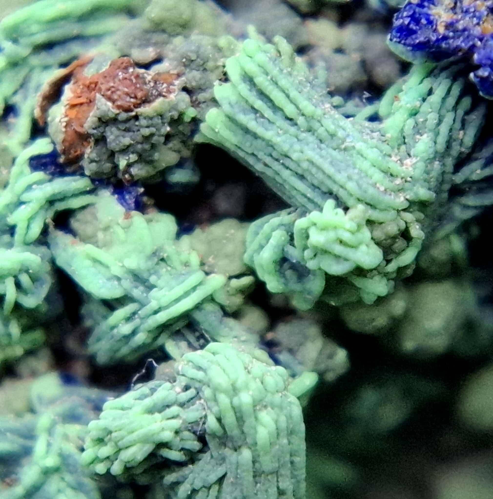 Azurite, conichalcite after azurite on limonite after siderite covered quartz crystals. There is a second olive green mineral I have not been able to identify yet. Alnif, Morocco