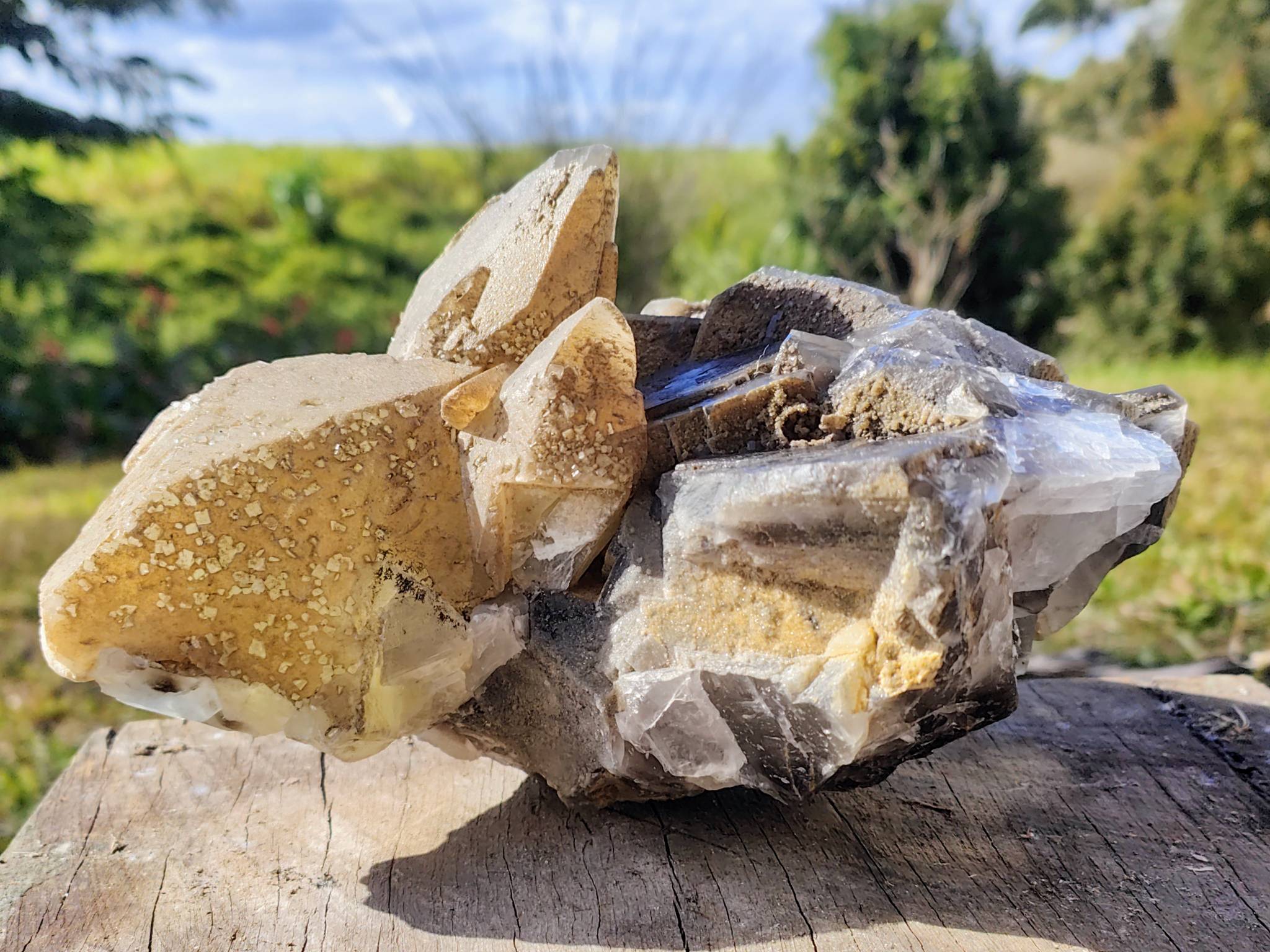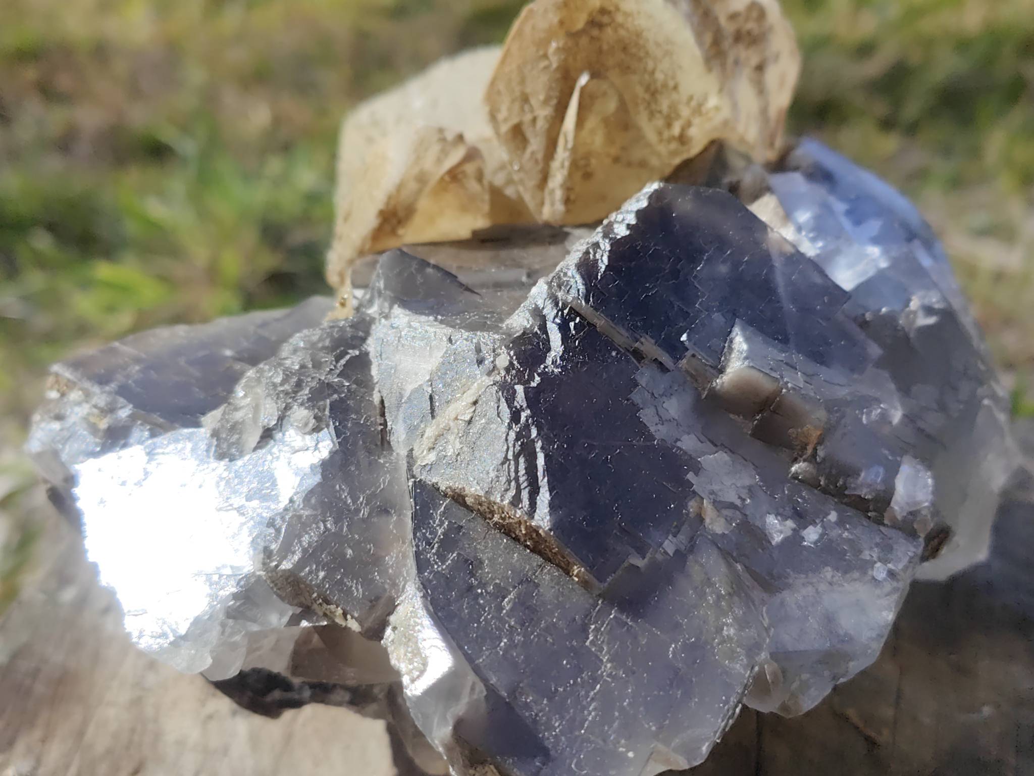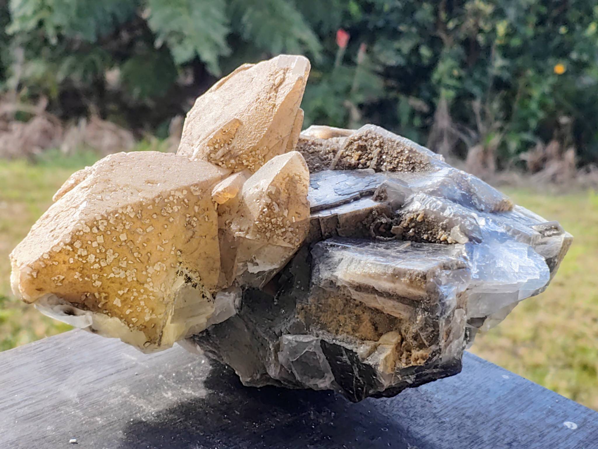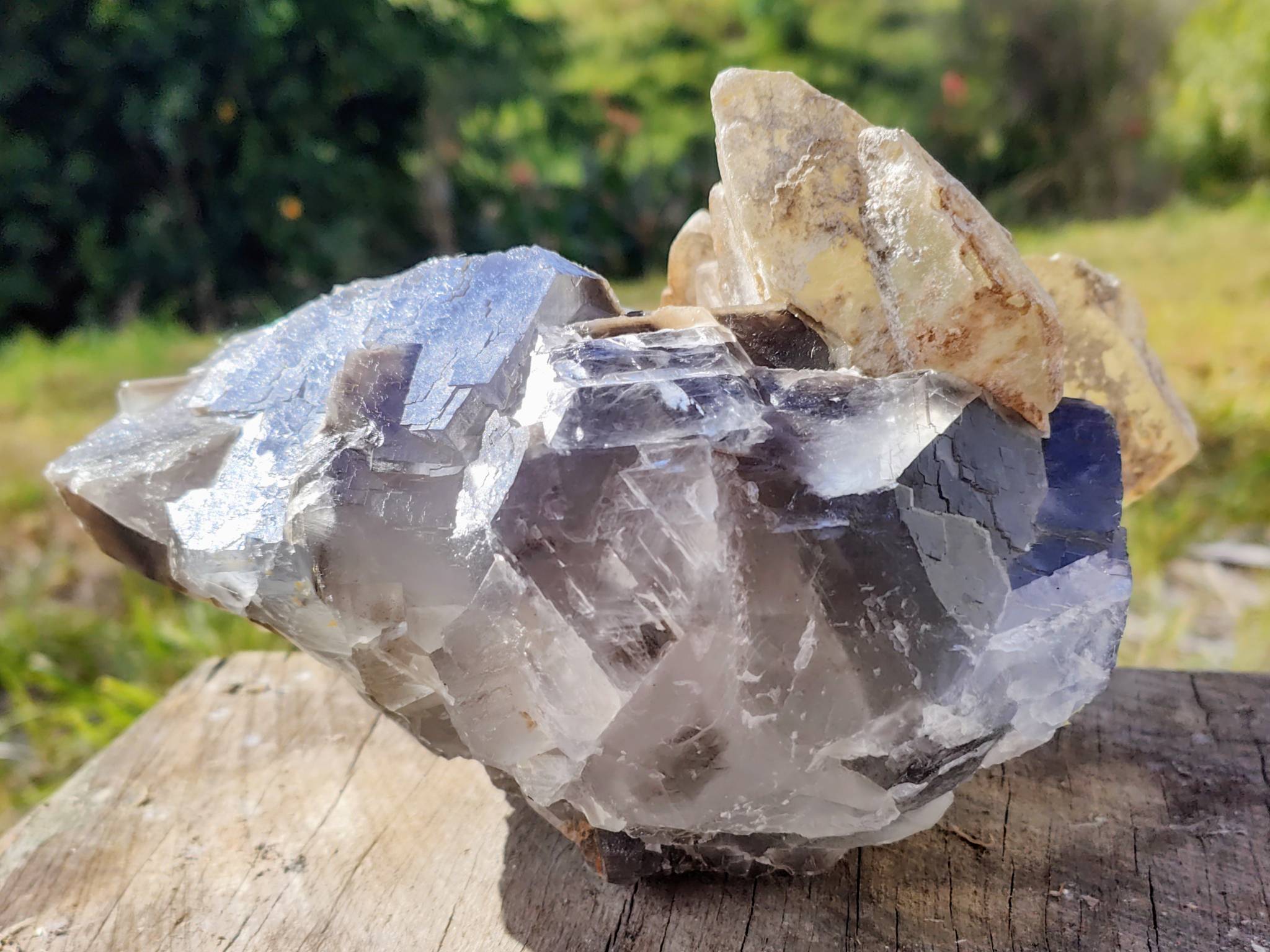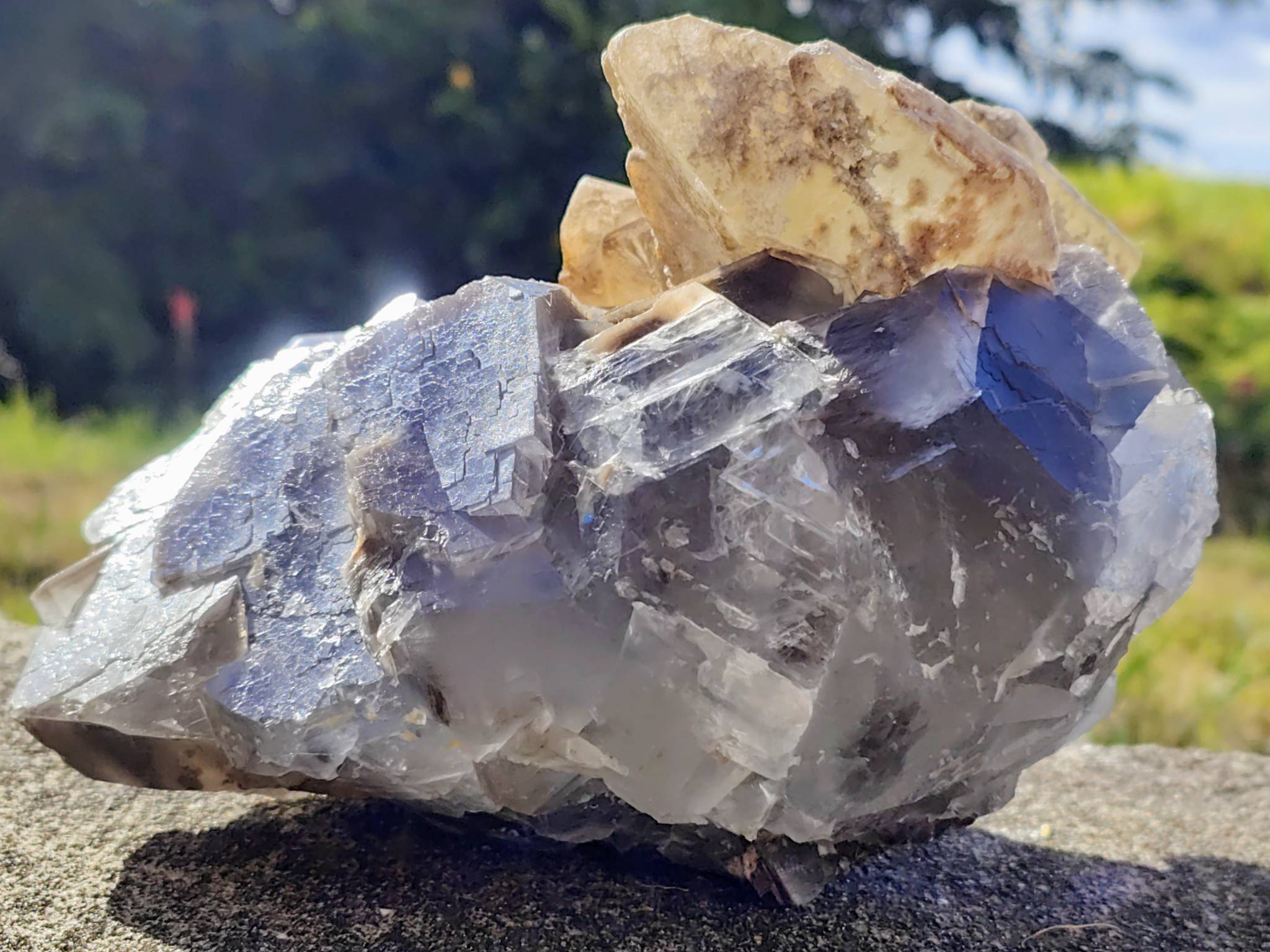 Large calcite crystals on large fluorite from Pakistan. 4.54kg and 24cm!! Blue grey, consisting of natural blue fluorite with a final layer of pale brown/grey giving an unusual colour. This has not been irradiated like most of the blue Chinese fluorite.