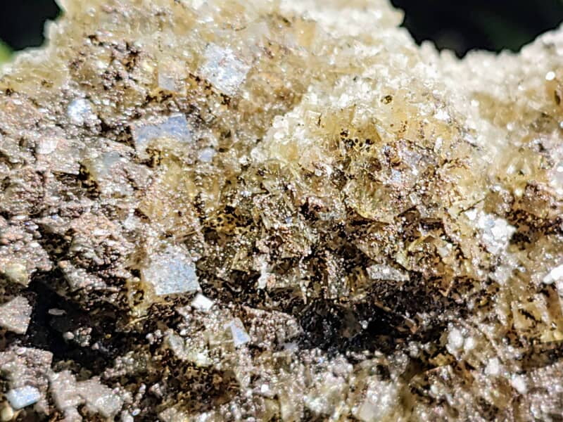 Yellow Moscona fluorite with a single Blue Barite blade, covered in sphaelerite crystals