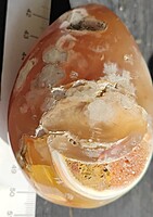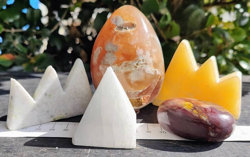 BB1012 Sakura egg, 85mm, selenite pyramid 48mm tall, mookaite palmstone 54mm, calcite mountain 73mm, serpentine mountain 70mm RRP $69 now $25