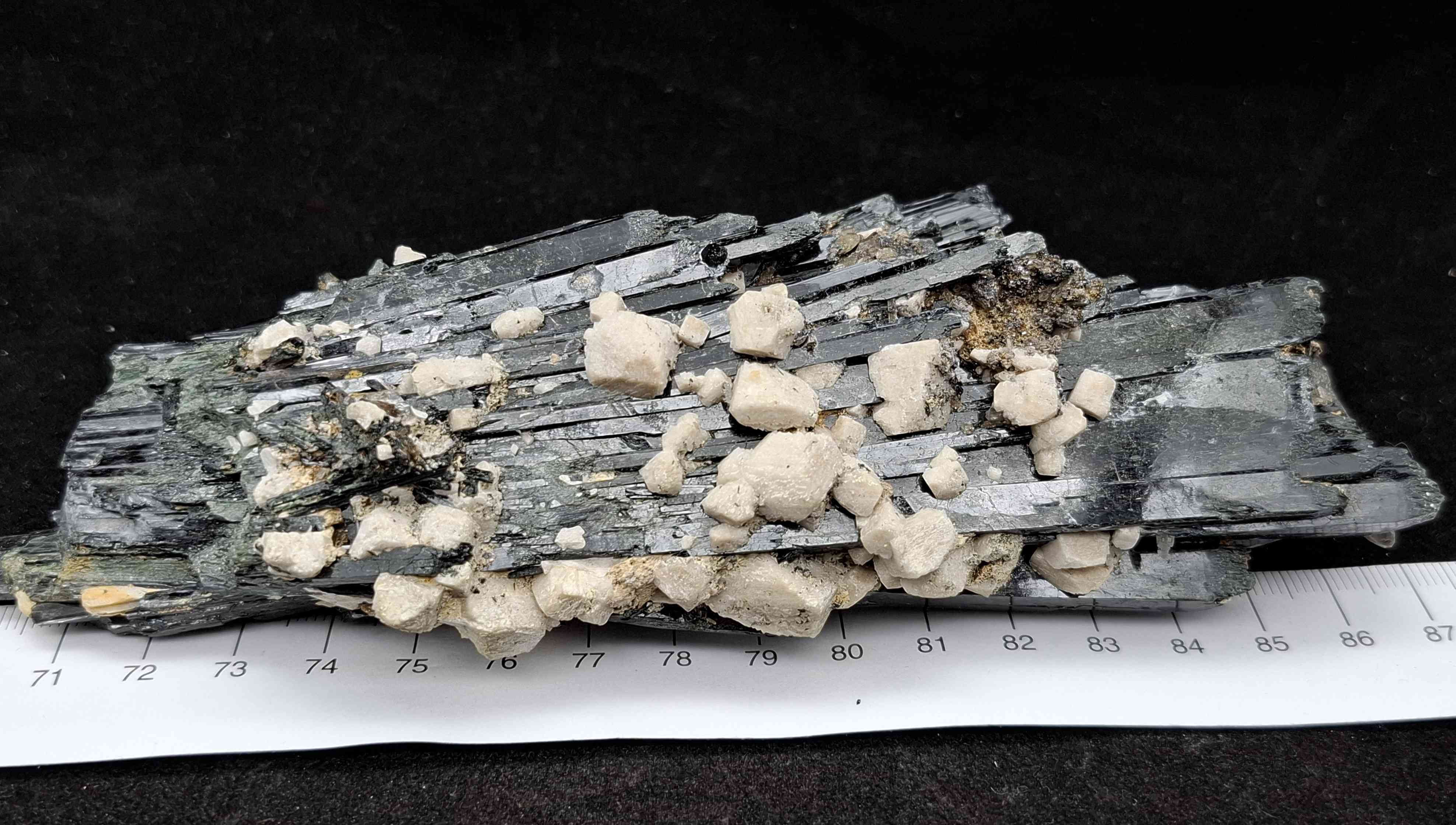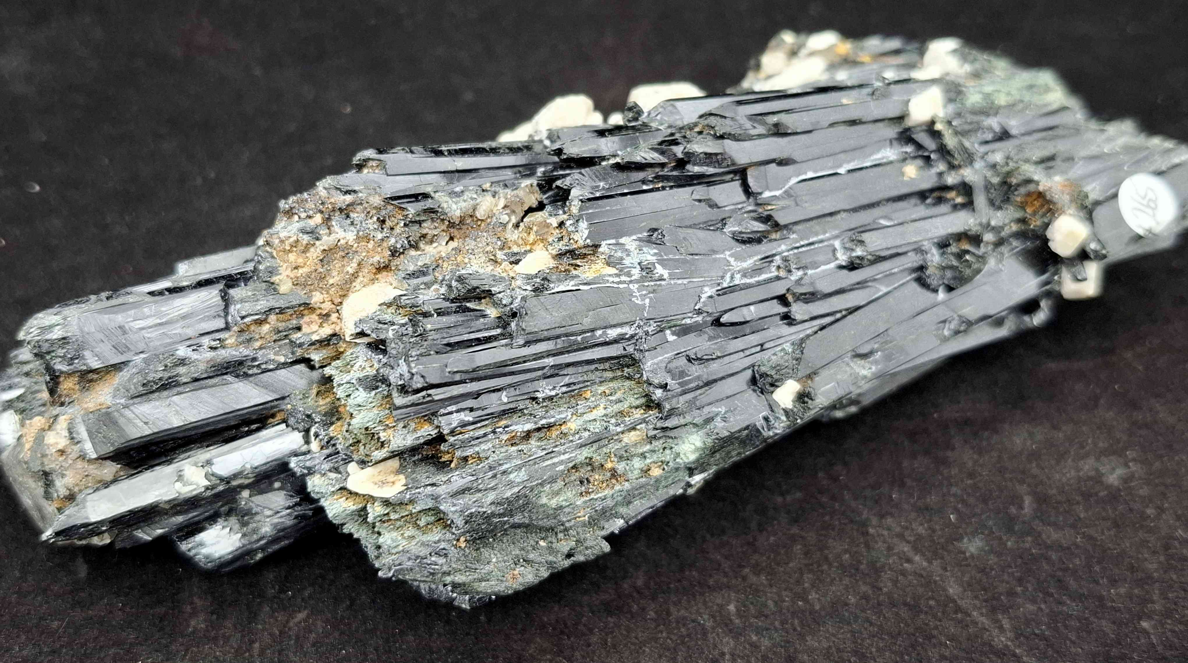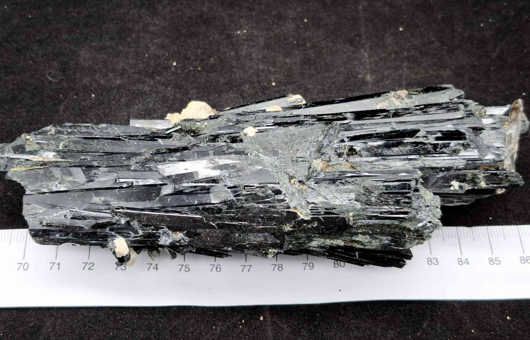 SPEC1084 Very large aegirine cluster with smaller feldspar crystals. Glossy black crystals from Mt Zomba, Malawi. 17cm $265