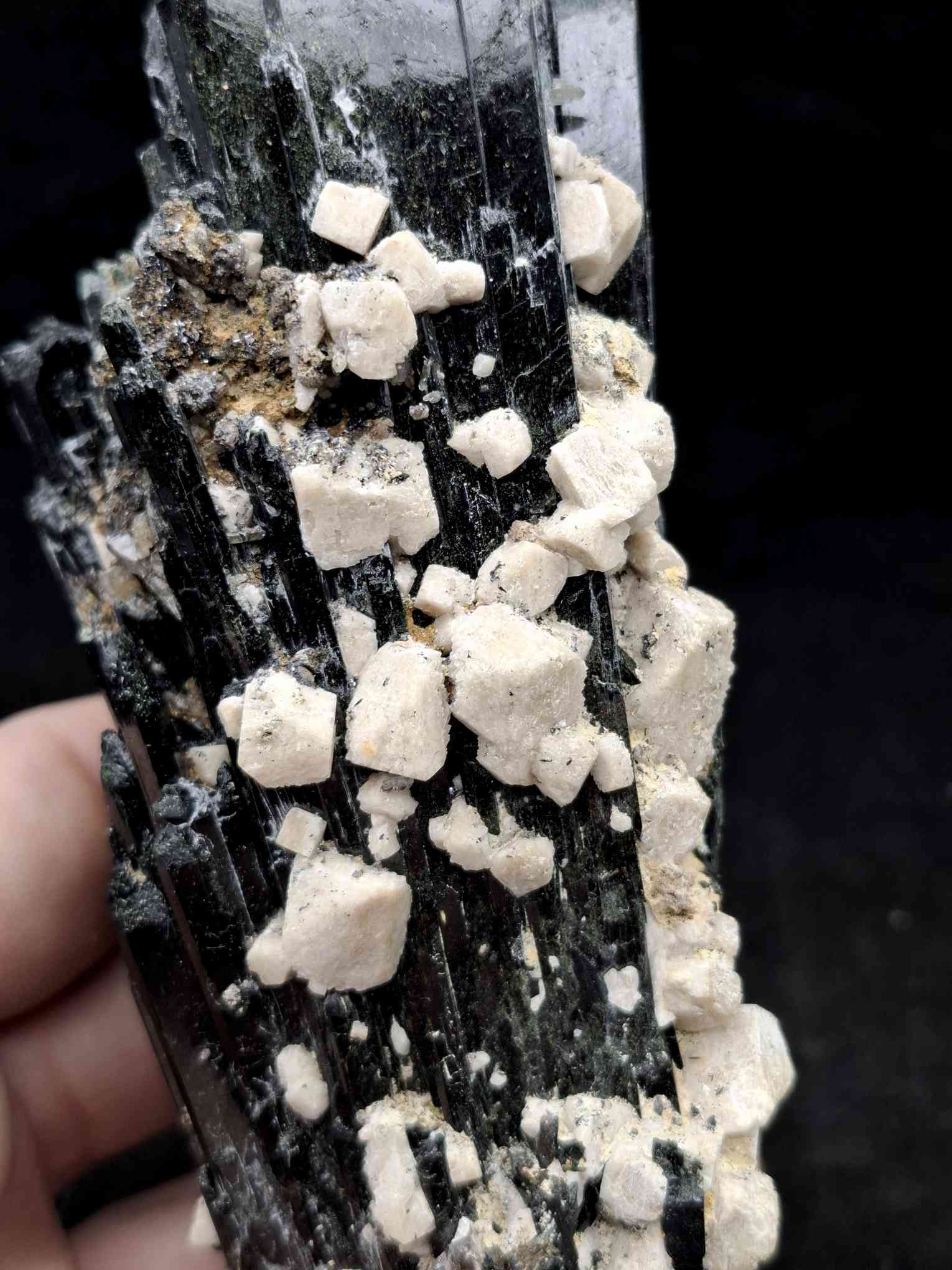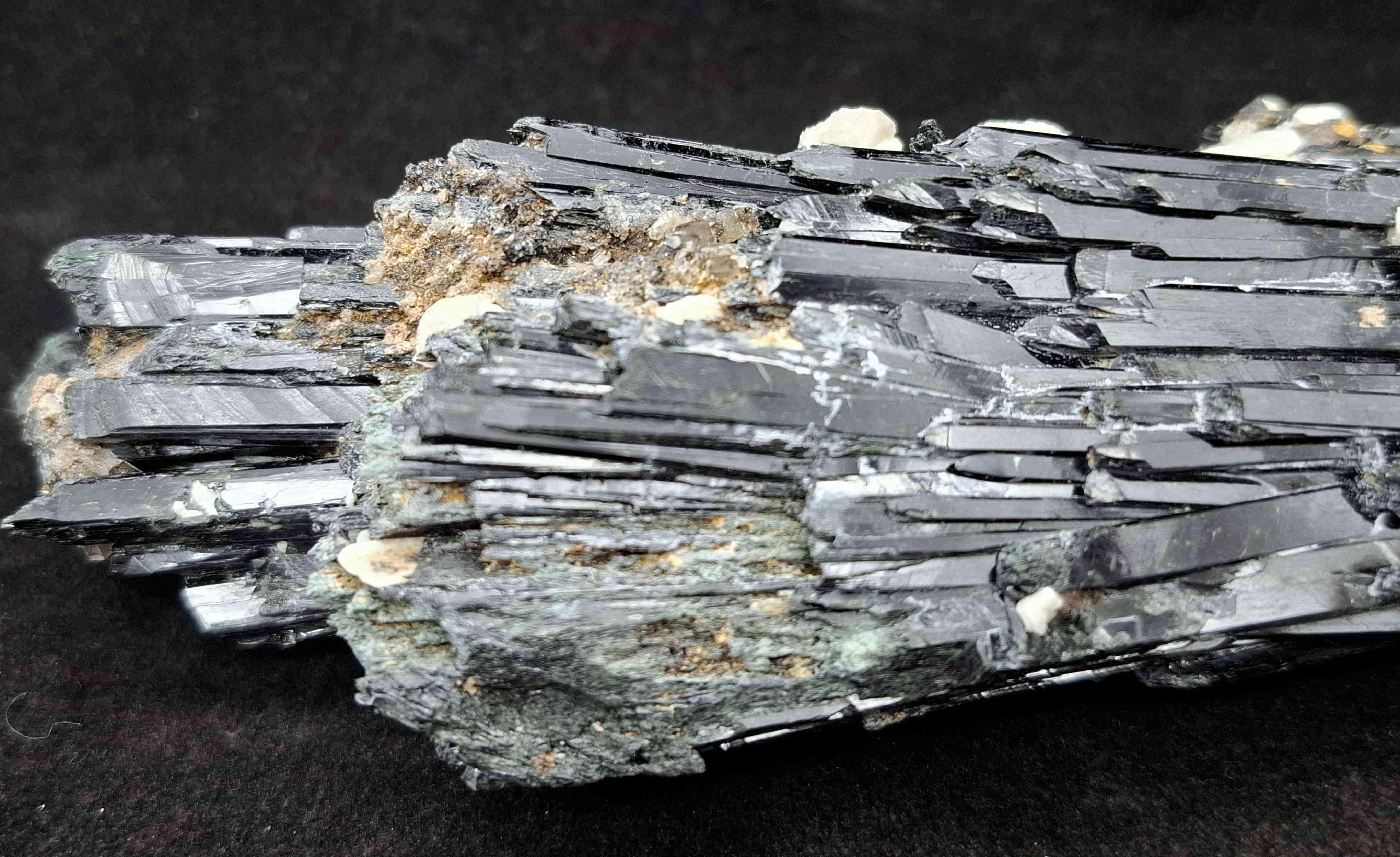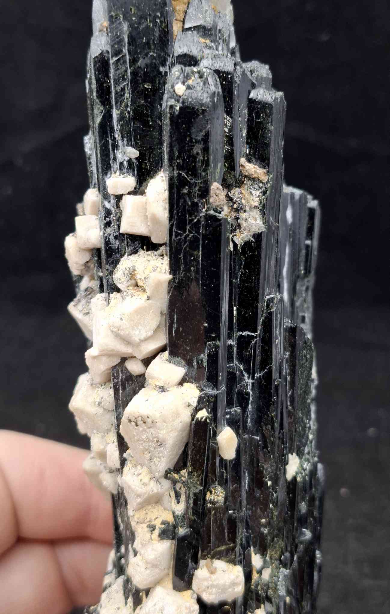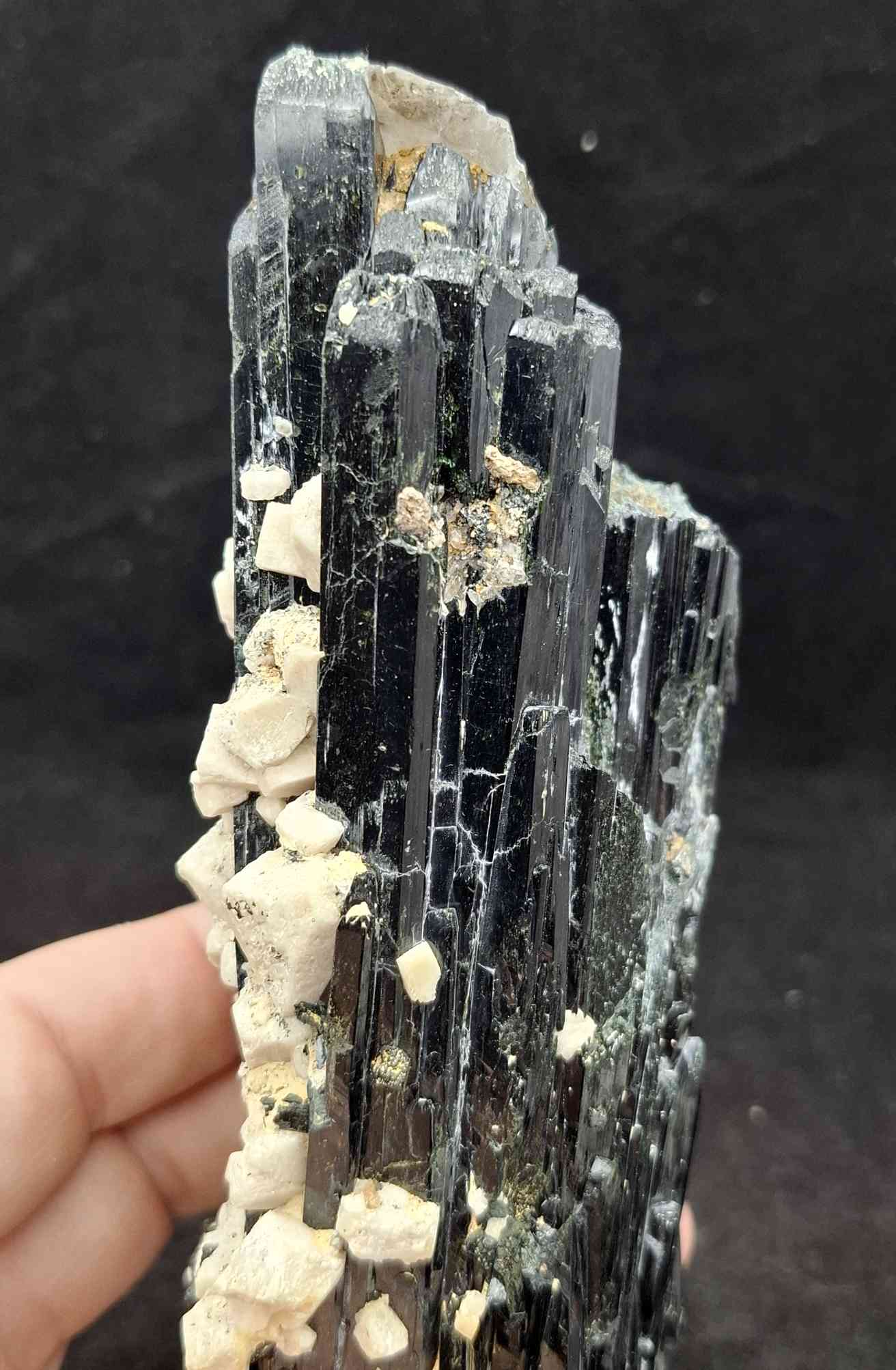 SPEC1084 Very large aegirine cluster with smaller feldspar crystals. Glossy black crystals from Mt Zomba, Malawi. 17cm $265