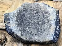 Quartz Druizy on dark grey chalcedony with goerthite. Likely a "ghost amethyst" (amethyst that has been under or overexposed to radiation)
