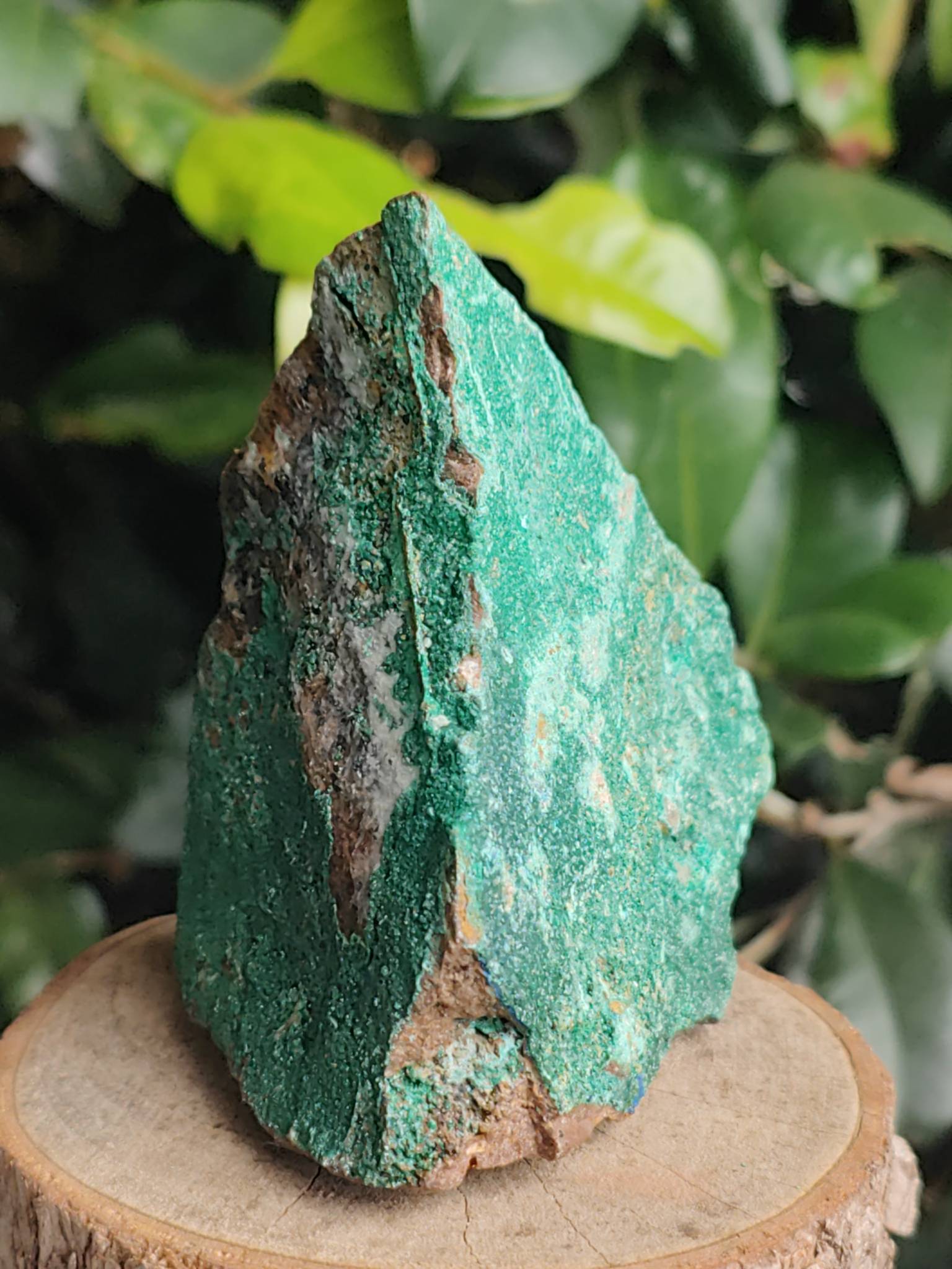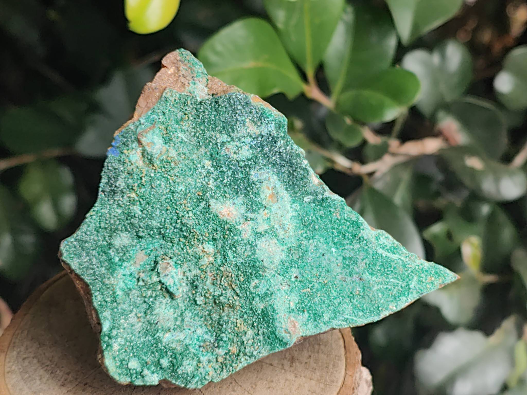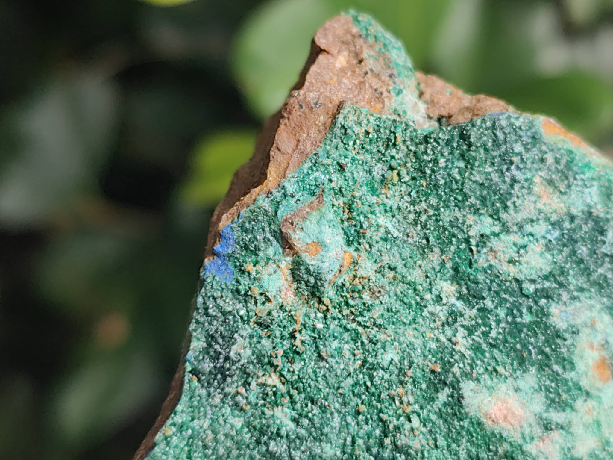 NAT1033 Malachite on matrix with a patch of gypsum overgrowth as well as some azurite. Chunky two sided piece from Morocco181g 78mm $28