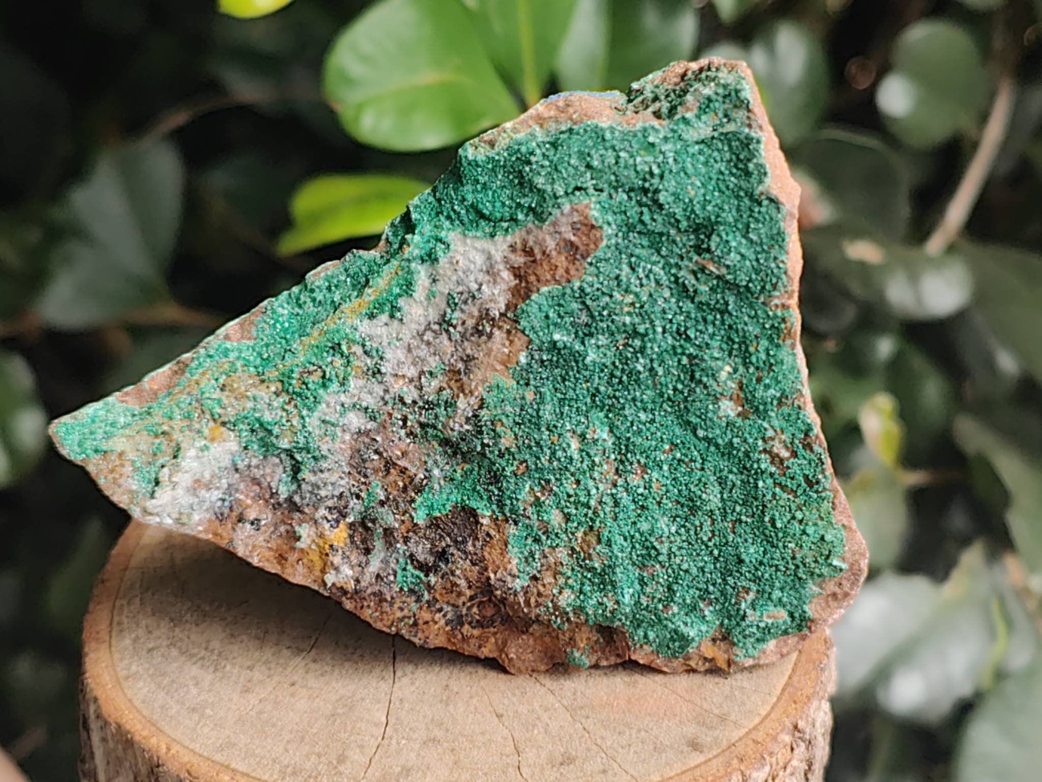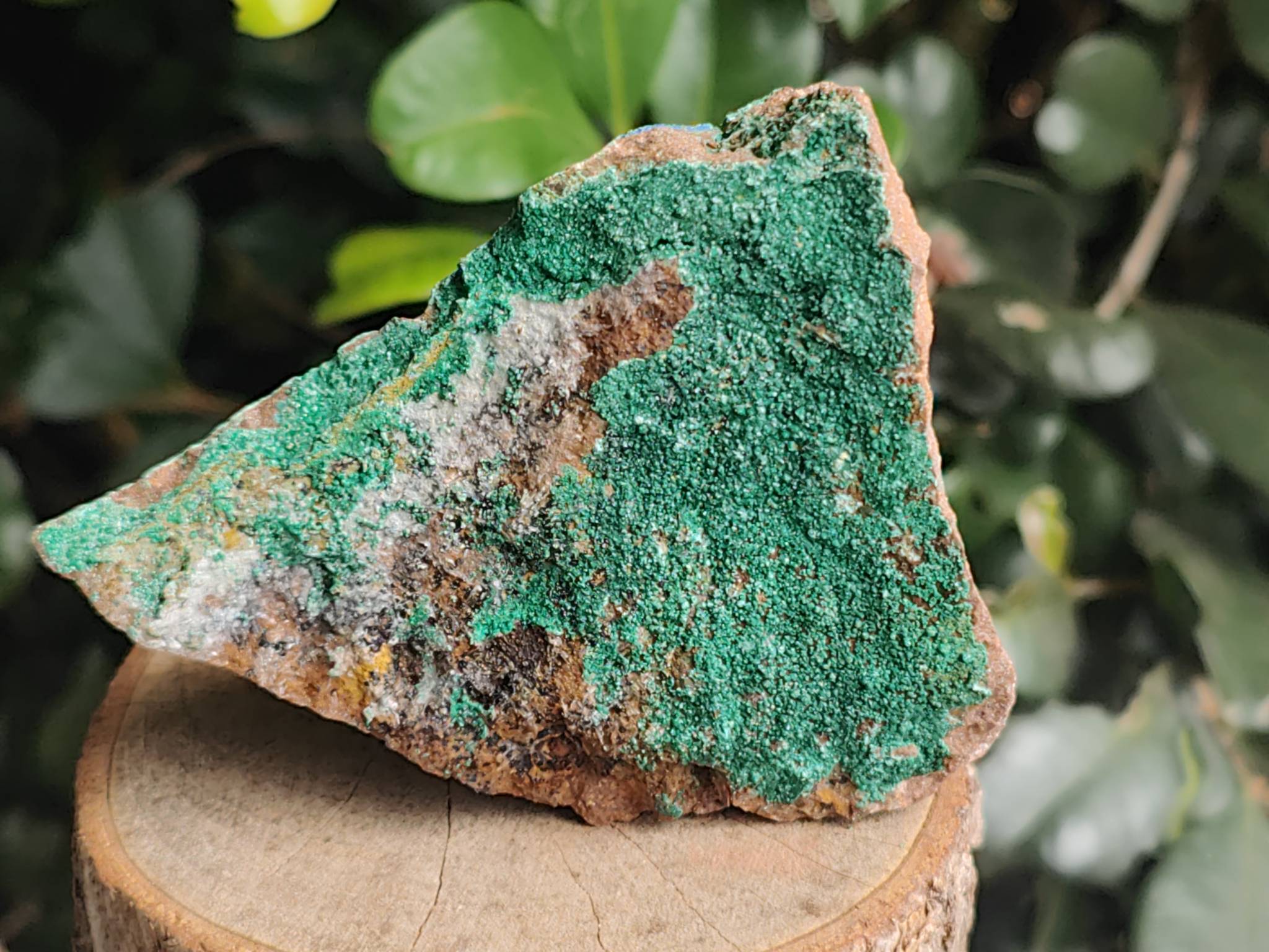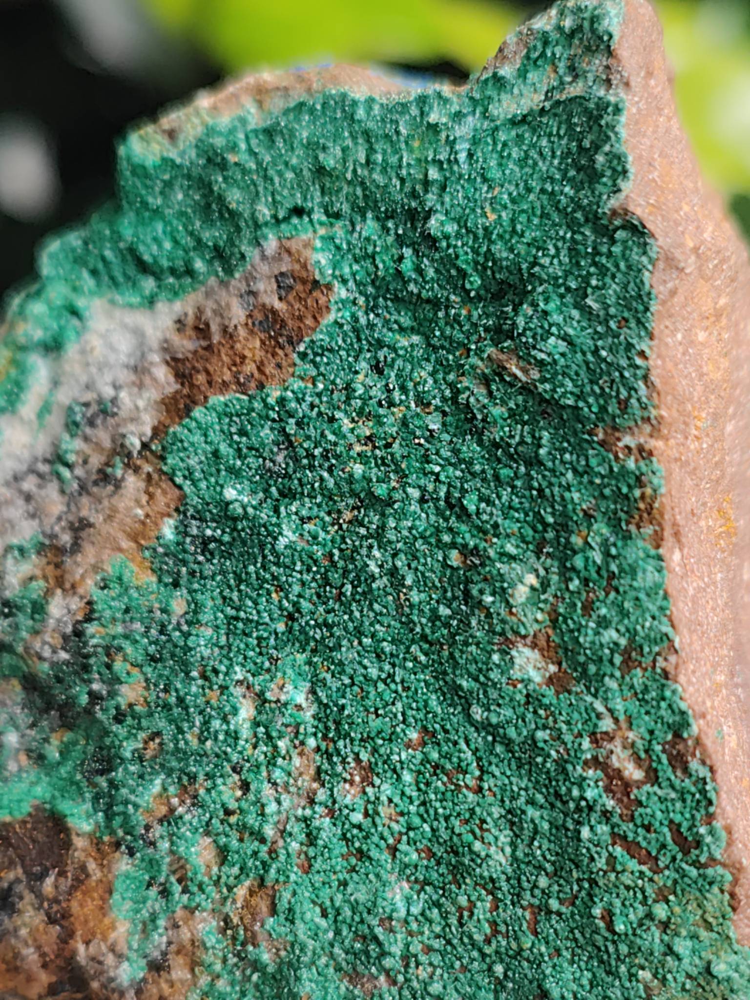 NAT1033 Malachite on matrix with a patch of gypsum overgrowth as well as some azurite. Chunky two sided piece from Morocco181g 78mm $28