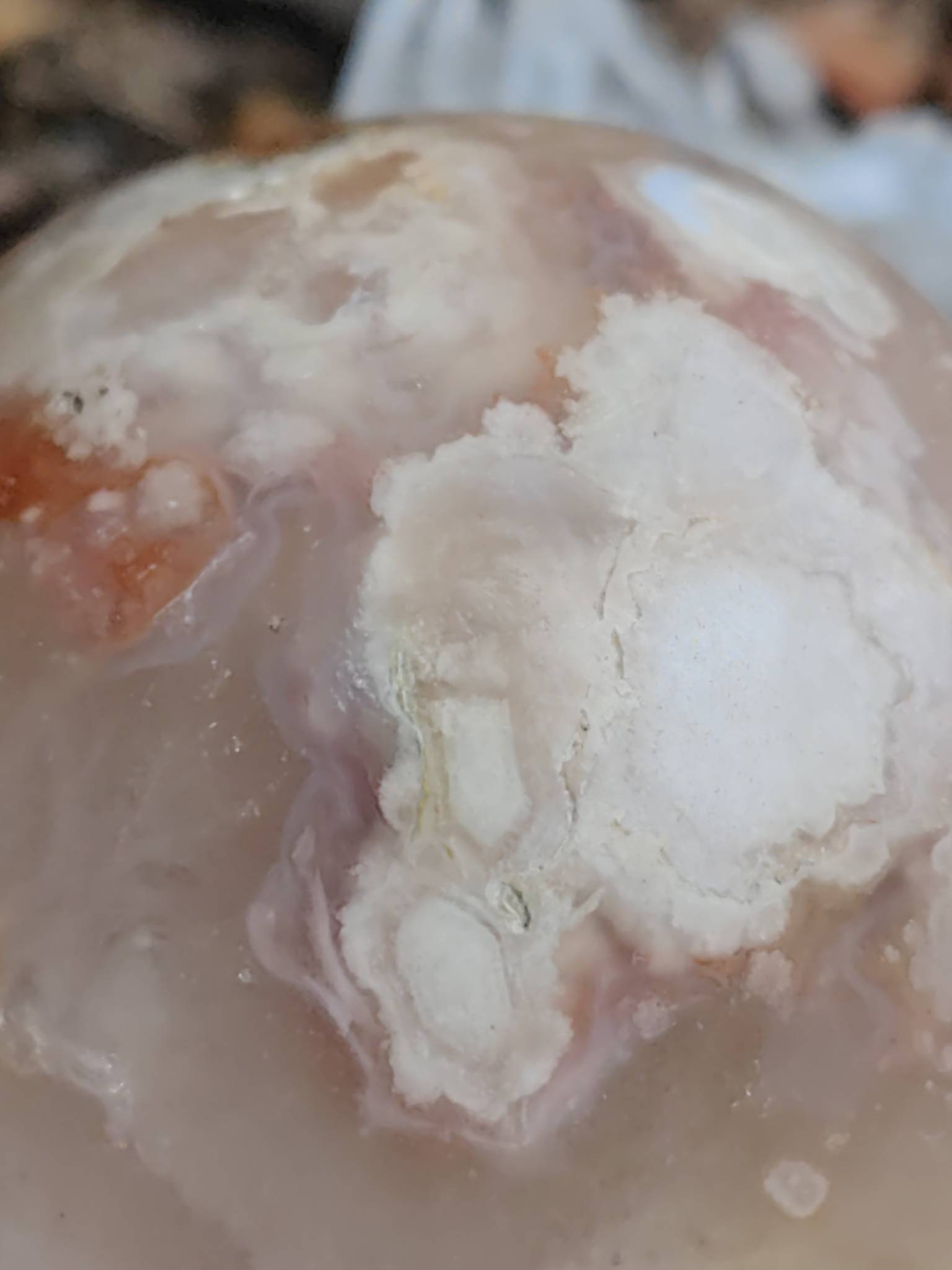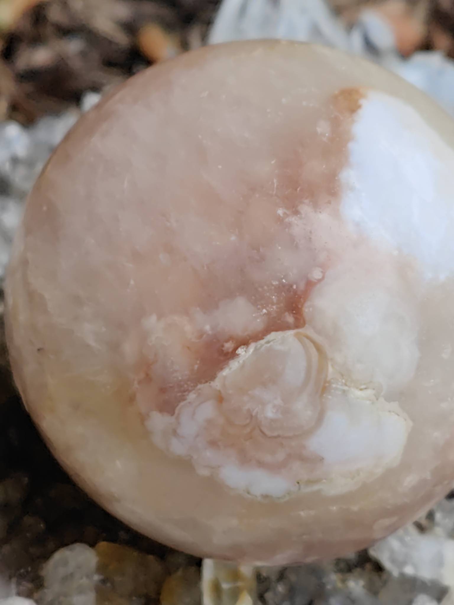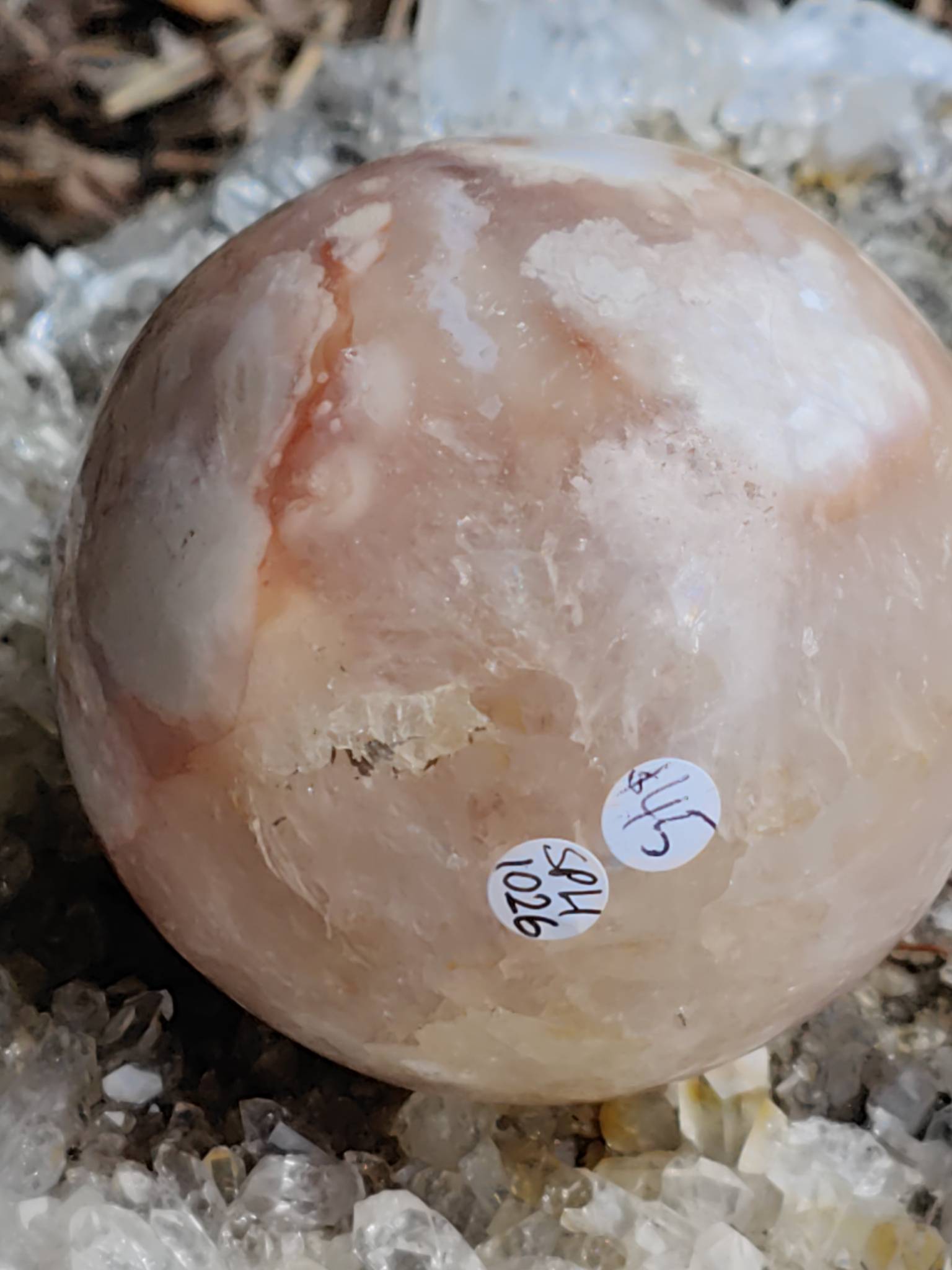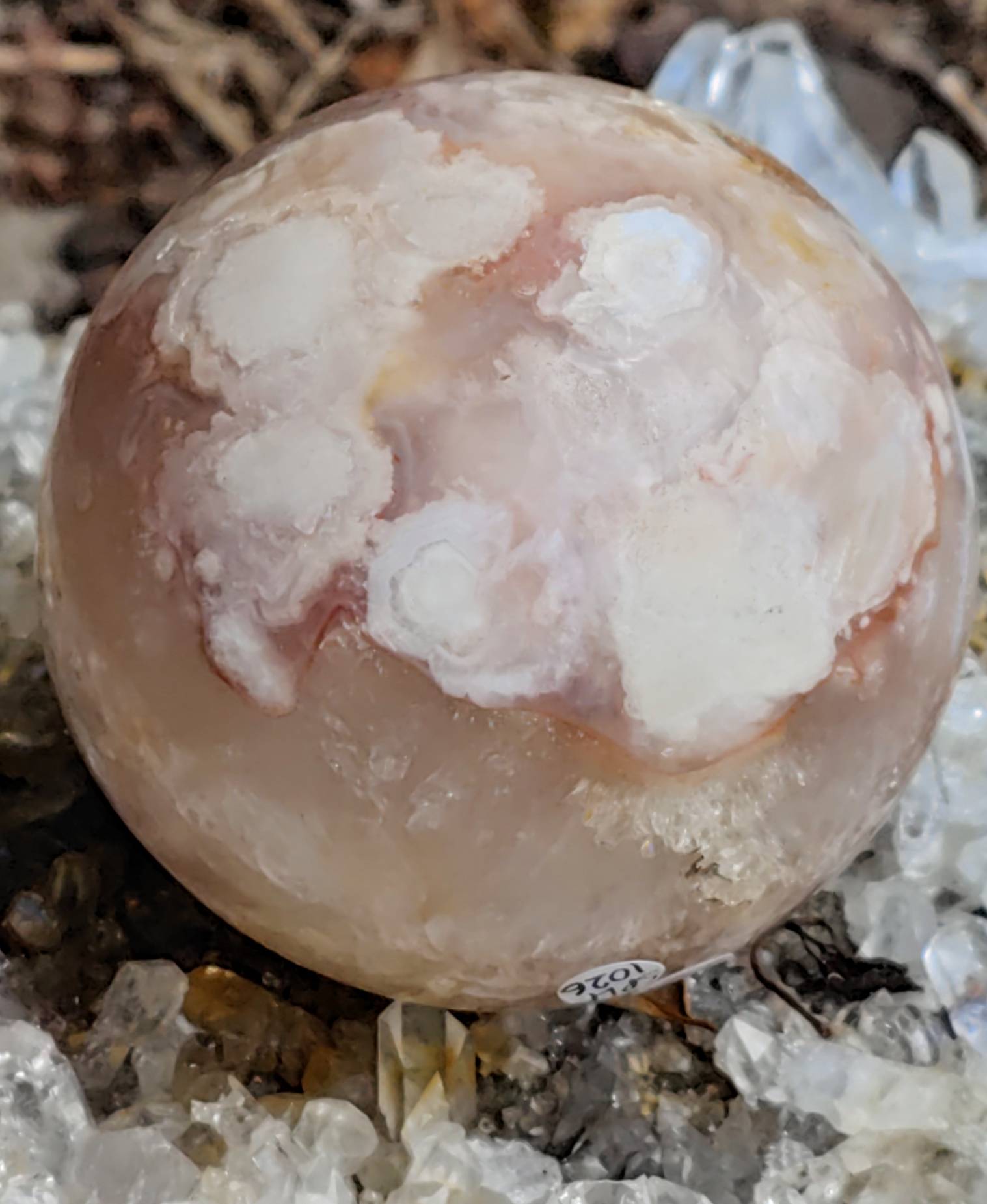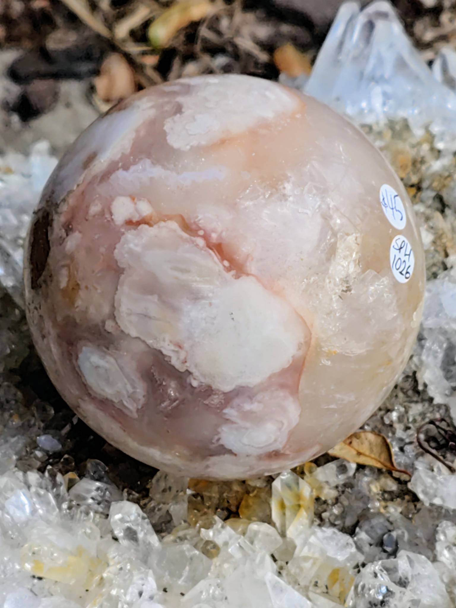 SPH1026 Sakura Flower Agate Sphere, hand polished. Lovely colour and 'blooms' 71mm $45