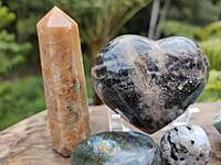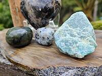 SET27 Feldspar Set; 58mm Amazonite, 75mm black moonstone heart, 97mm Peach moonstone generator, white moonstone tumble, 53mm labradorite $40