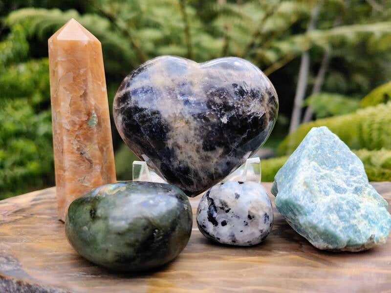 Feldspar Set; 58mm Amazonite, 75mm black moonstone heart, 97mm Peach moonstone generator, white moonstone tumble, 53mm labradorite $40