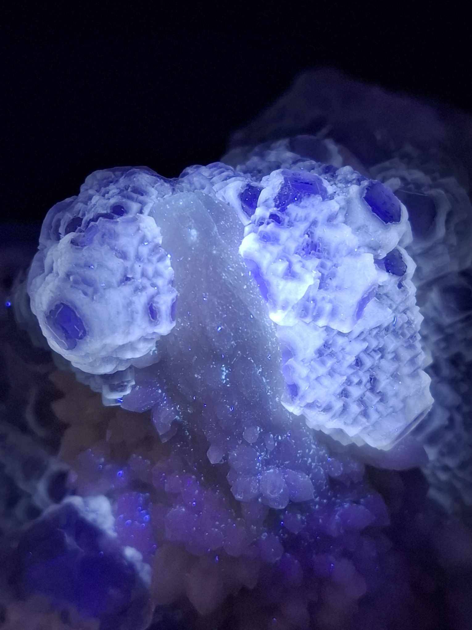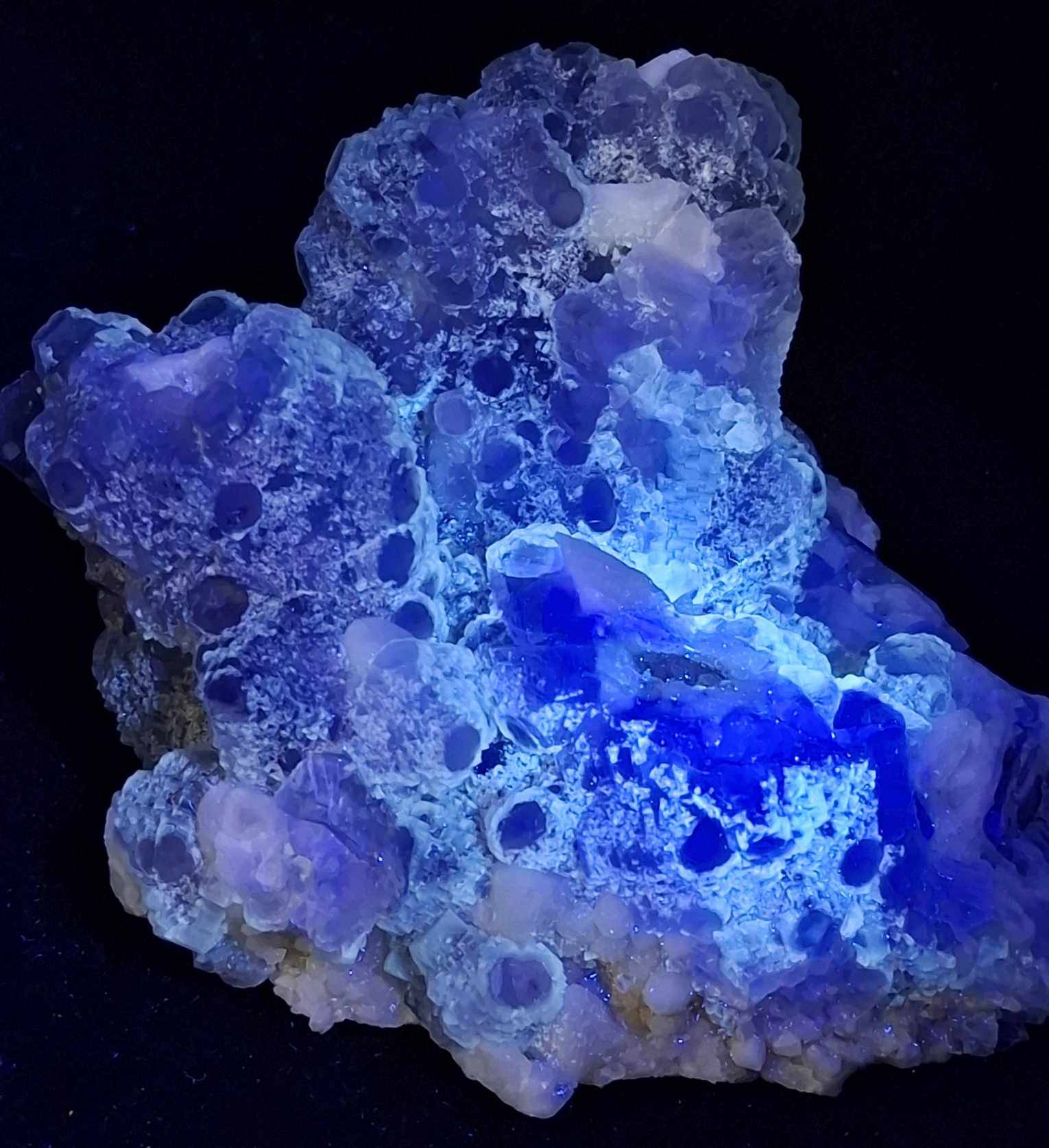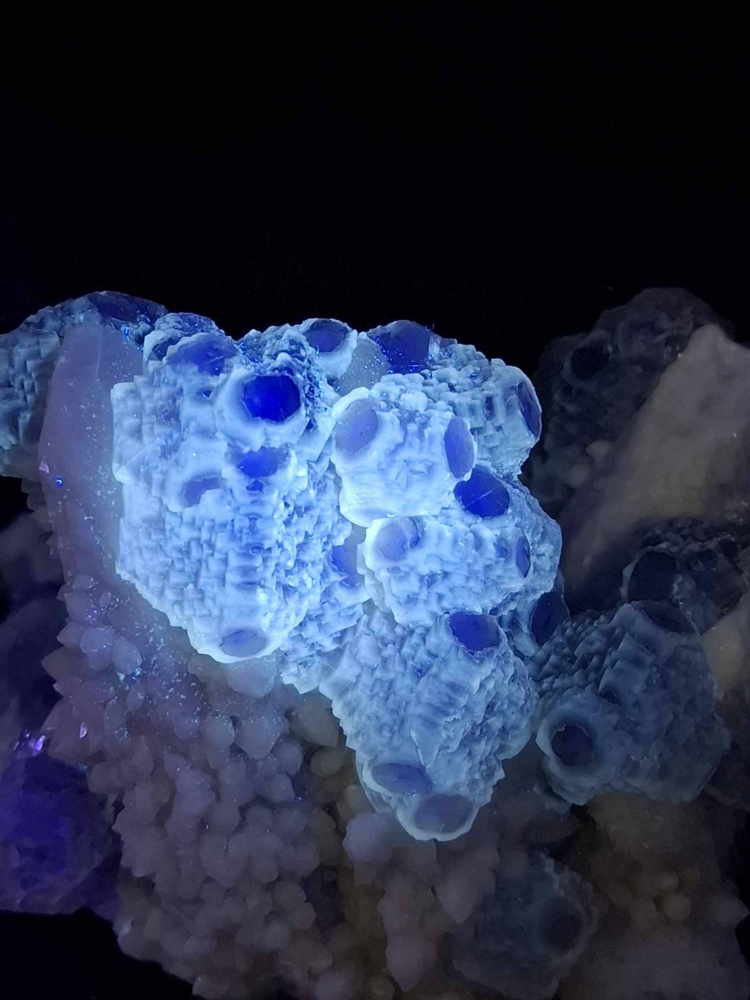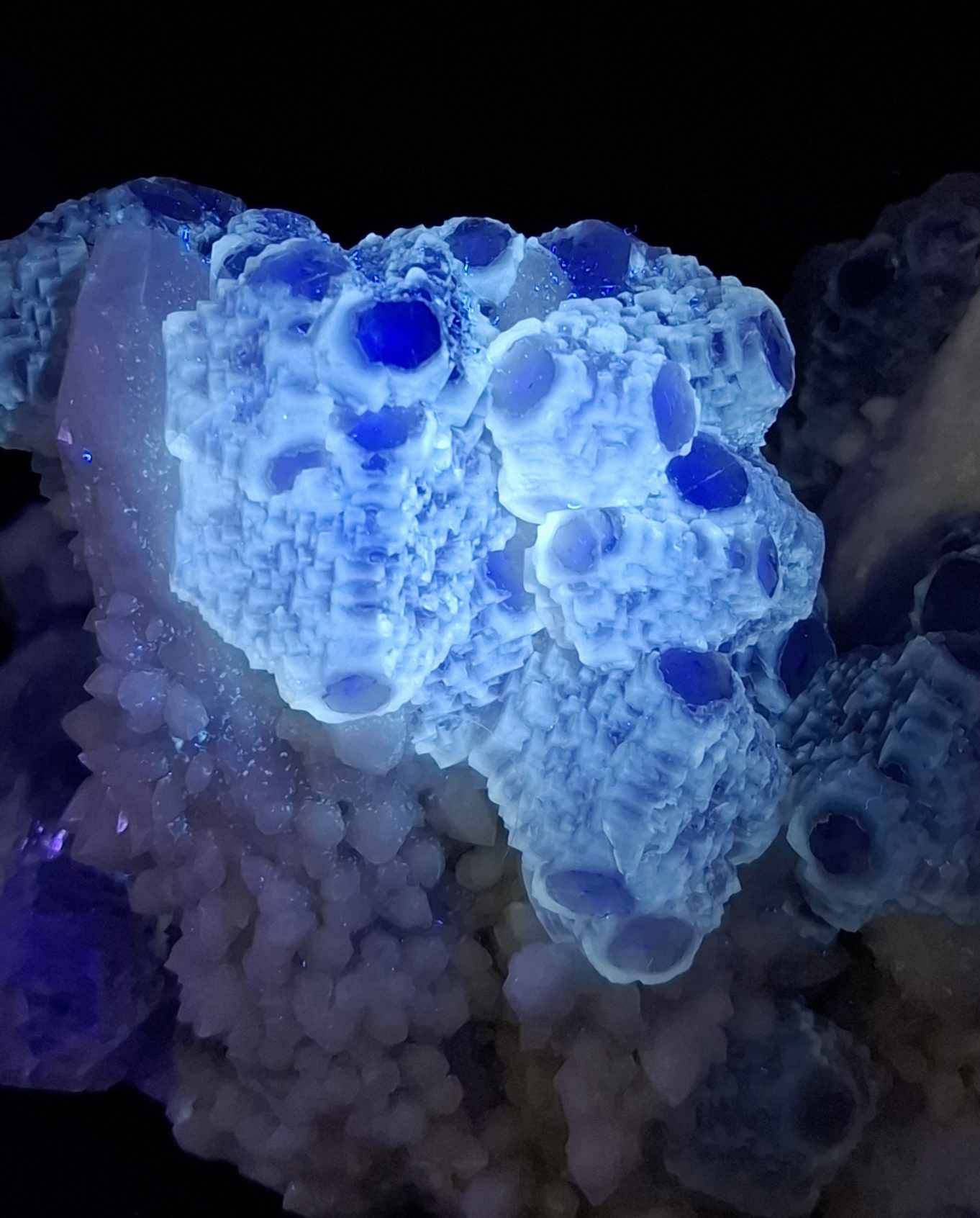 Blue Fluorite with yellow fluorite over Candle Quartz, Inner Mongolia. Large specimen 120mm base and 75mm high. UV reactive with phosphorescence