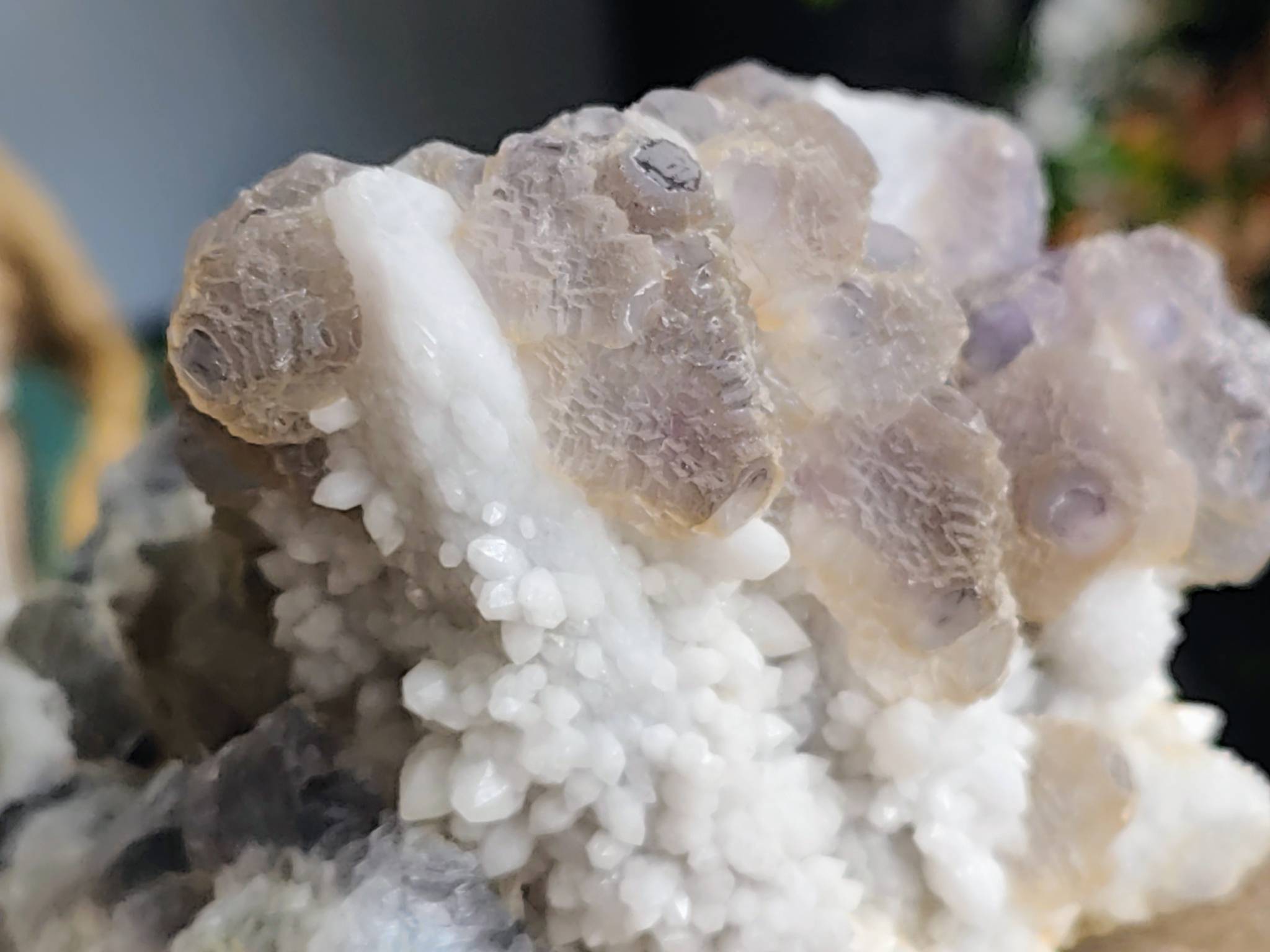 SPEC1001 (Video) Blue and Yellow Fluorite over Candle Quartz, Inner Mongolia. Large specimen 120mm base and 75mm high. UV reactive with phosphorescence $800