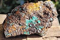 aus013 Malachite with siderite from Mineral Hill, New South Wales, Australia. Green sprays of malachite with iron minerals on goethite matrix. 94mm $17