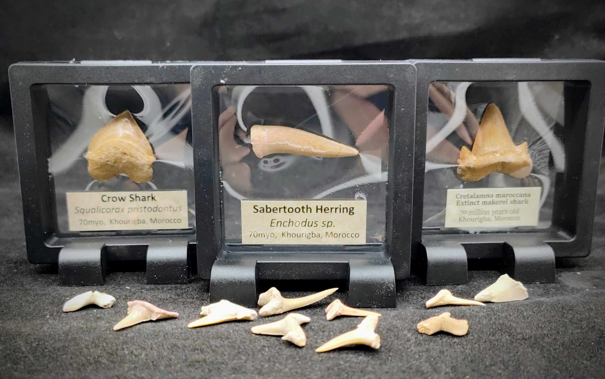 Contains: *Cretolamna maroccana *Squalicorax pristodondus *Enchodus Each in a 7cm display case PLUS+ Bonus fossil teeth!